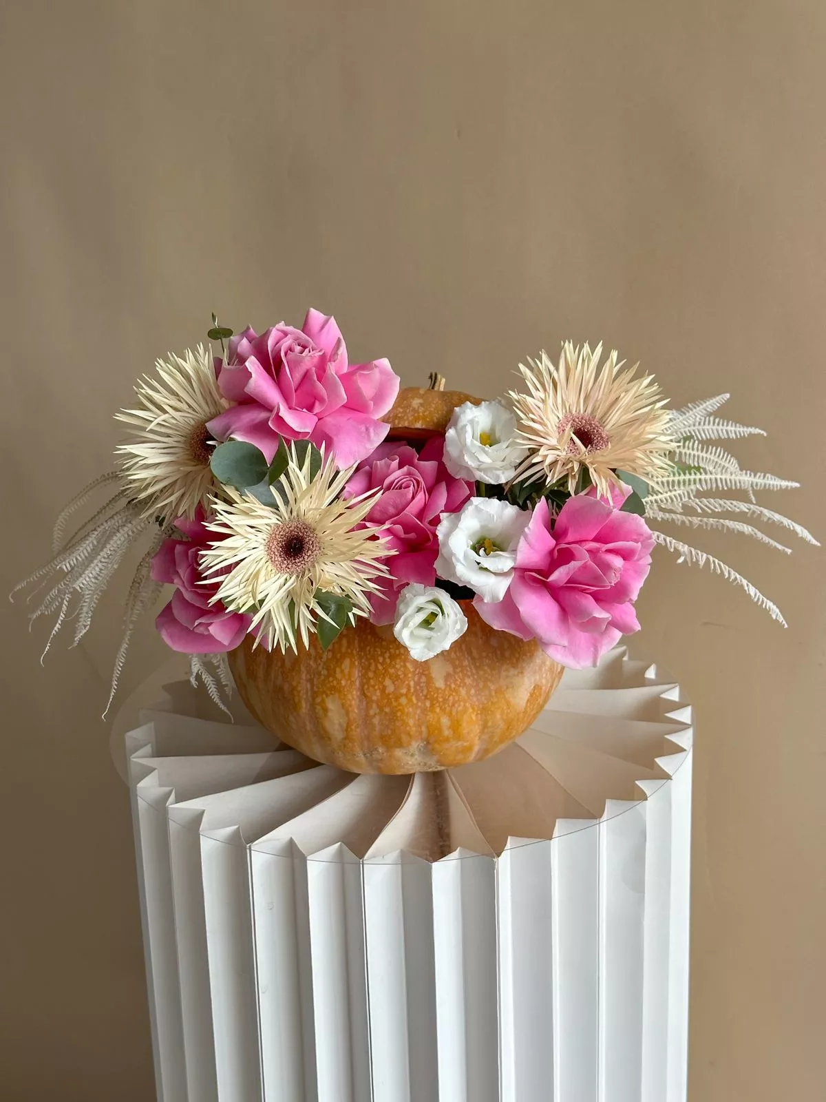Композиция в тыкве "Sintia" из лизиантусов, роз и гербер. Если Вы хотите подарить незабываемые эмоции дорогому человеку — закажите доставку цветов в Zakazbuketovkz