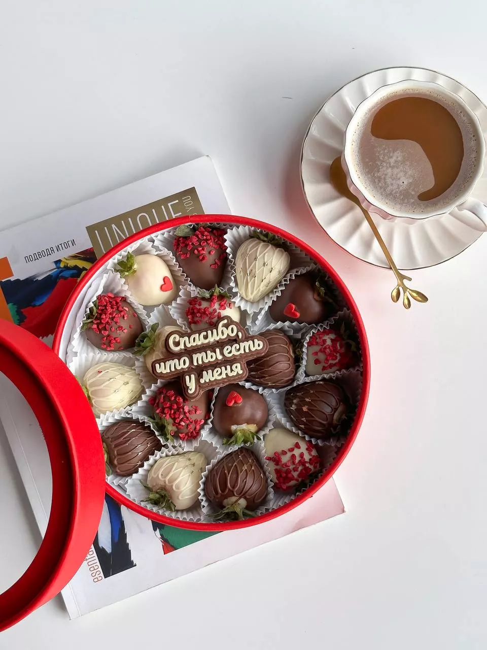 Клубника в шоколаде - 17; Шоколадная надпись - 1; Коробка для макаронс - 1; Открытка - 1;