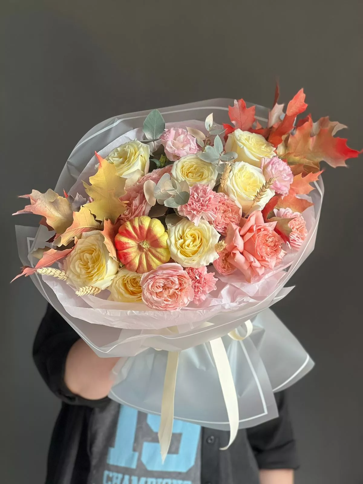 Композиция "Sensi" из роз, лизиантусов, гвоздик и кукурбиты в стильном оформлении. Если Вы хотите подарить незабываемые эмоции дорогому человеку — закажите доставку цветов в Zakazbuketovkz