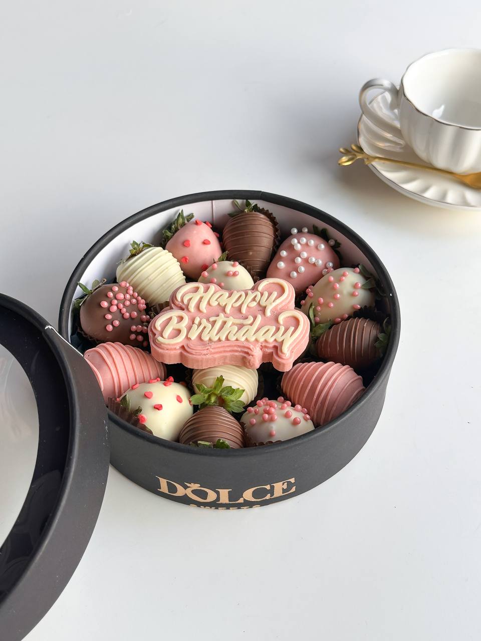 Клубника в шоколаде - 16; Шоколадная надпись - 1; Открытка - 1; Коробка для макаронс - 1;