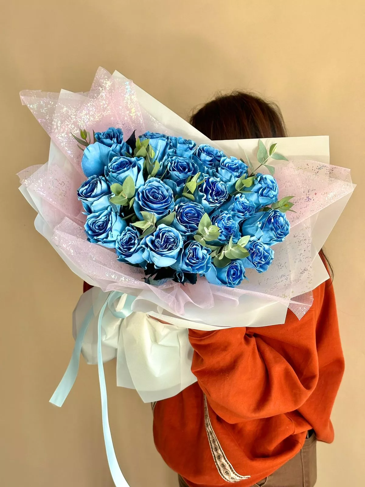 21 голубая роза с эвкалиптом в стильном оформлении№ Если Вы хотите подарить незабываемые эмоции дорогому человеку — закажите доставку цветов в Zakazbuketovkz