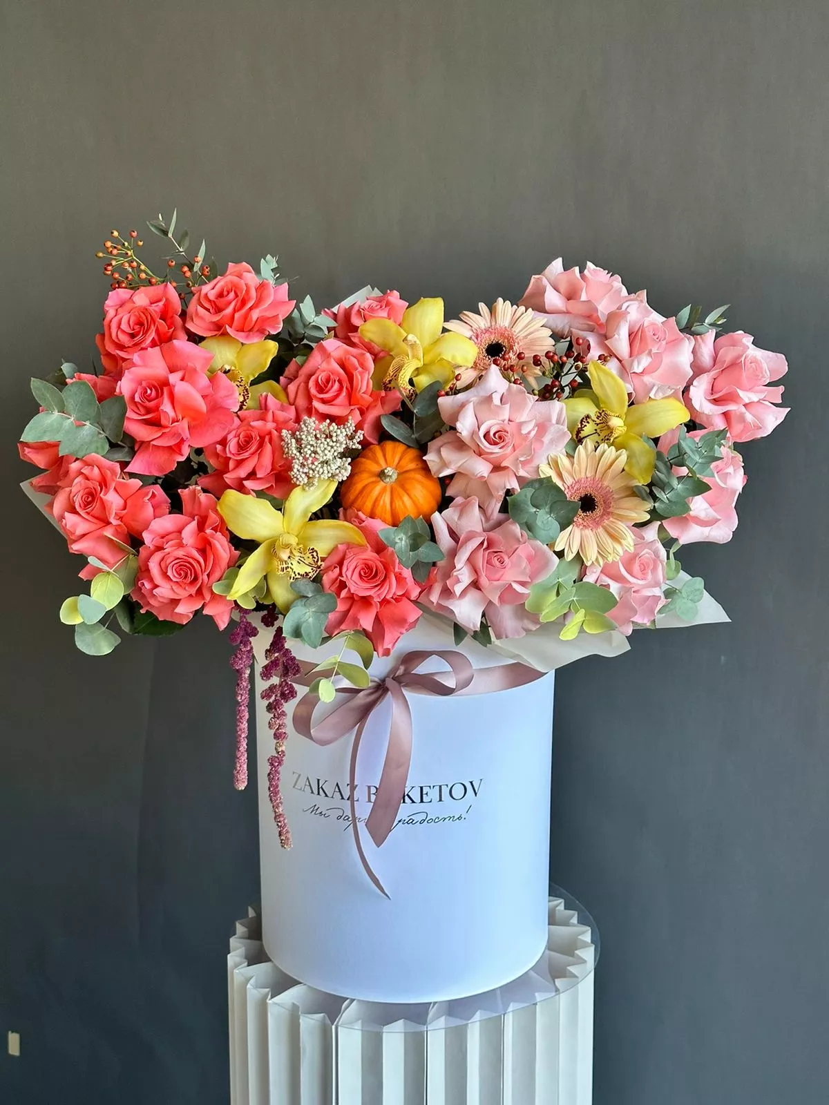 Композиция "Королева Виктория" из роз, гербер, орхидей и кукурбиты в коробке. Если Вы хотите подарить незабываемые эмоции дорогому человеку — закажите доставку цветов в Zakazbuketovkz