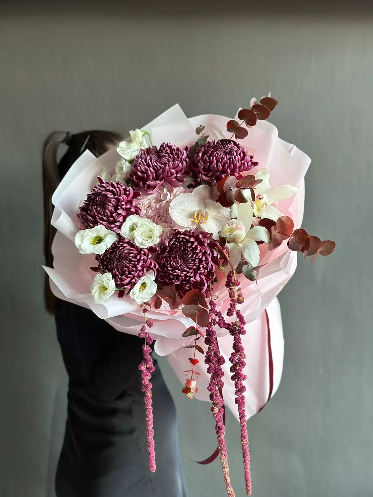 Гортензия (Колумбия) - 1; Хризантема Бигуди - 5; Лизиантус (Израиль) - 3; Эвкалипт (Голландия) - 1; Амарант Голландия - 3; Орхидея цимбидиум-МИНИ (Голландия) - 2; Орхидея фаленопсис - 1; Калька в ассортименте - 4; Открытка - 1; Шпажка для открытки - 1;