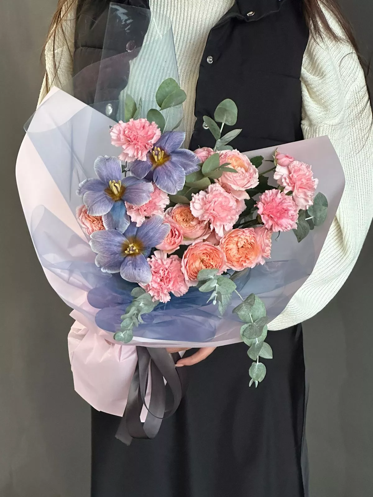 Букет "Наяда" из гвоздик, спрей роз и тюльпанов в стильном оформлении. Если Вы хотите подарить незабываемые эмоции дорогому человеку — закажите доставку цветов в Zakazbuketovkz