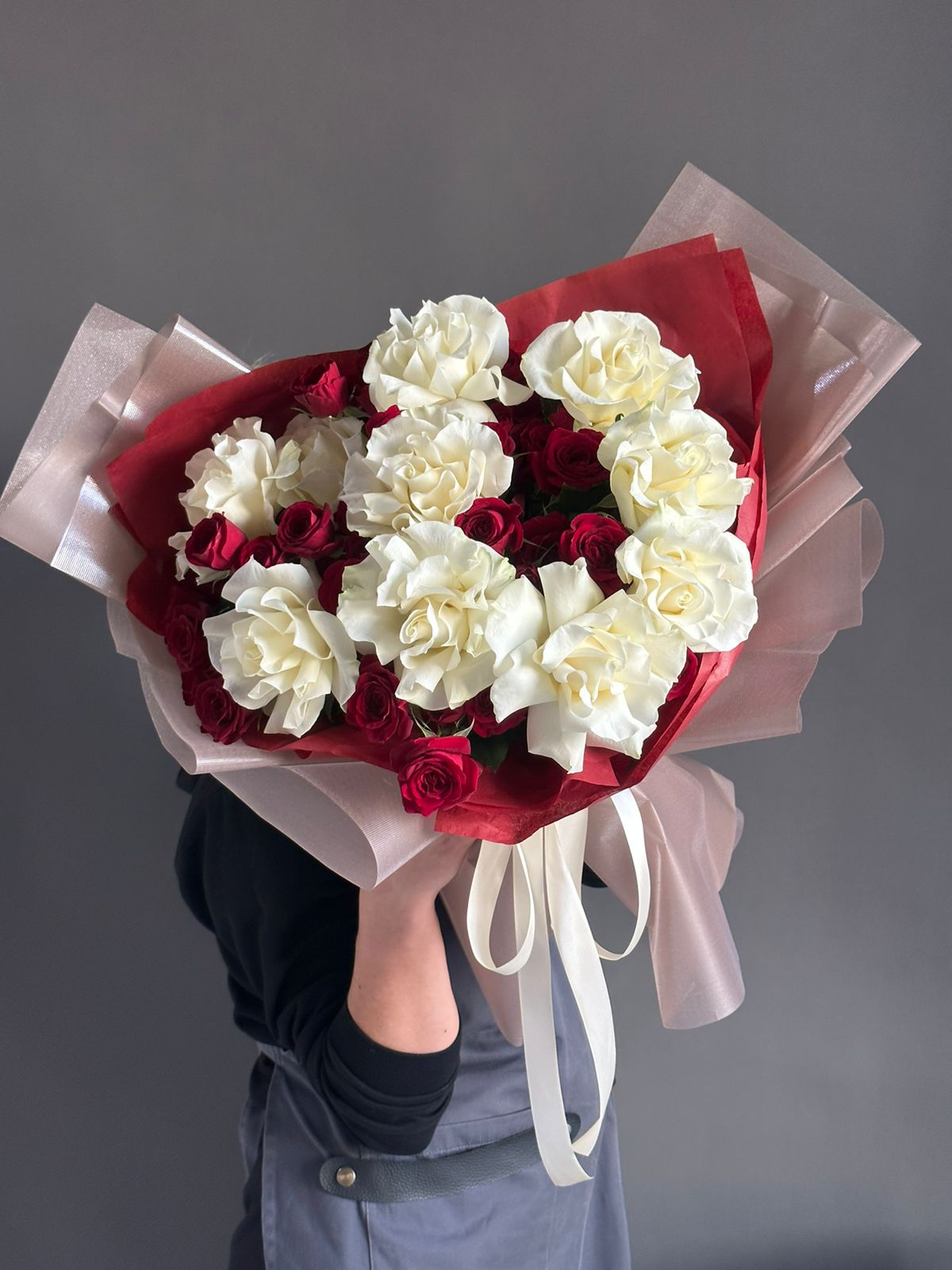Букет из белых и бордовых роз - символ любви и страсти. Эти цветы станут прекрасным подарком для тех, кто дорог вашему сердцу. Подарите им радость и счастье вместе с этим красивым букетом от ZakazBuketov!