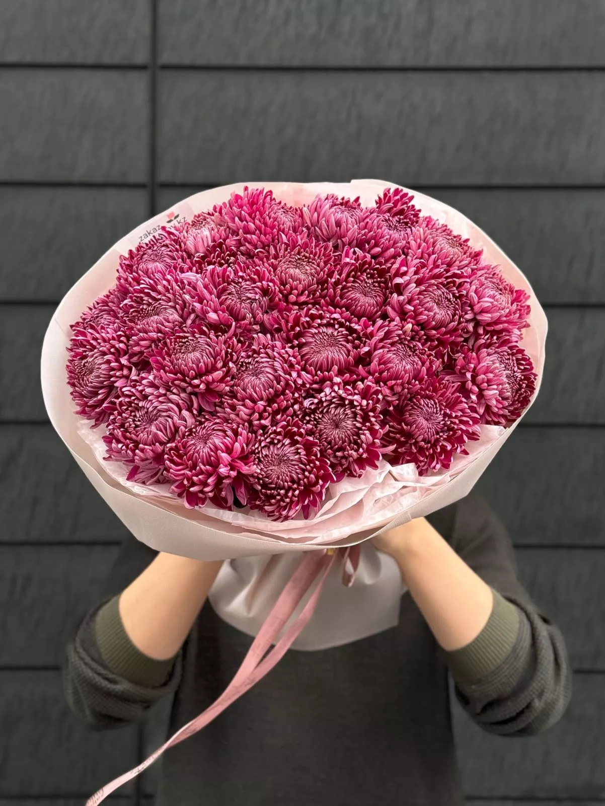 Букет из 25 крупных хризантем от ZakazBuketov - это прекрасный способ выразить свои чувства. Эти яркие и красочные цветы станут украшением любого интерьера и подарят радость Вам и Вашим близким.