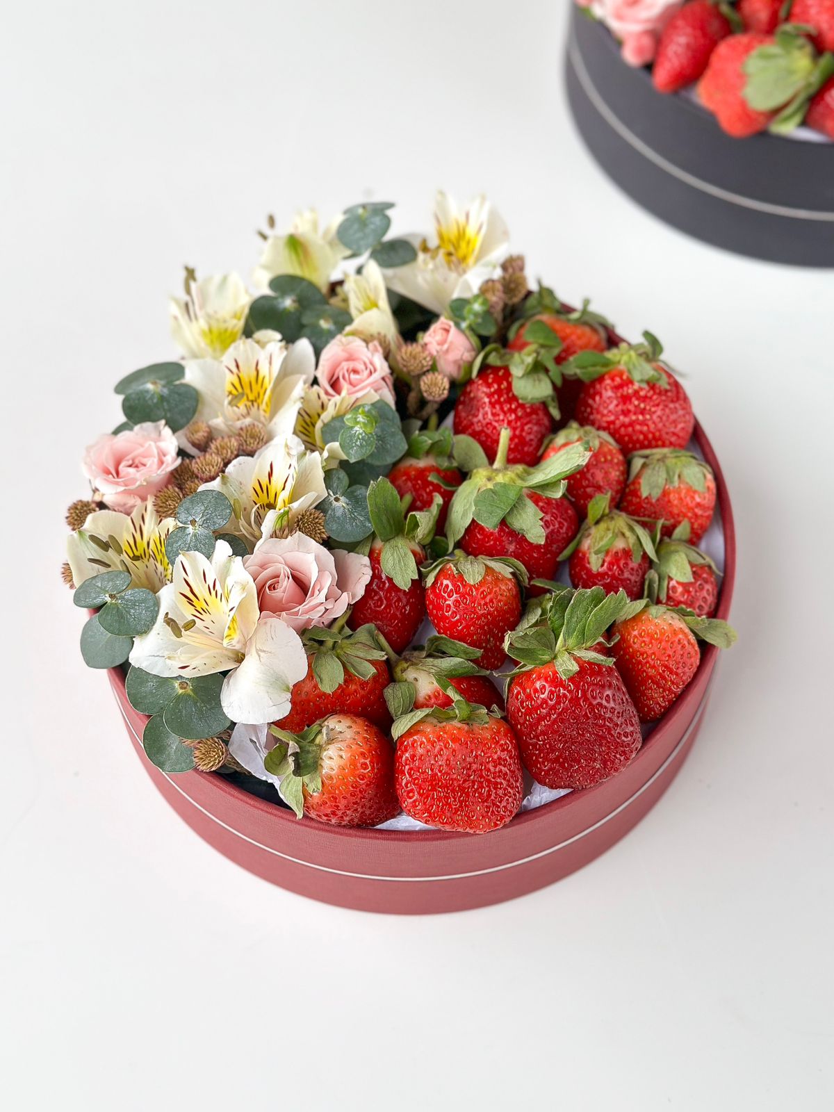 Восхитительная композиция из свежей клубники, нежных альстромерий и спрей роз станет идеальным украшением вашего стола. Тонкий аромат цветов и клубники наполнит ваш дом радостью и теплом. Подарите вашим близким частичку летней атмосферы в любое время года!