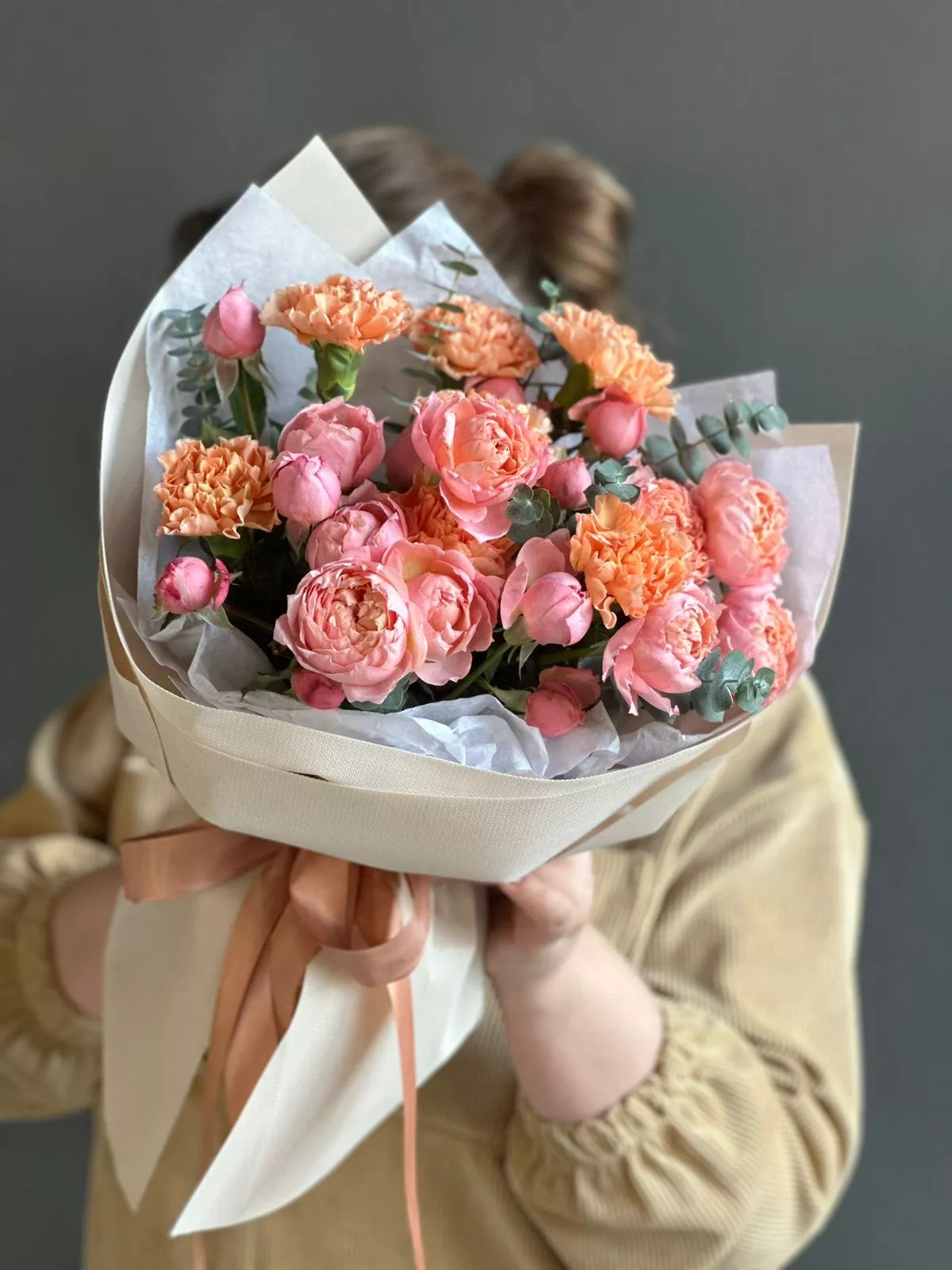Композиция "MirageMeadow" из гвоздик, пионовидных спрей роз и эвкалипта