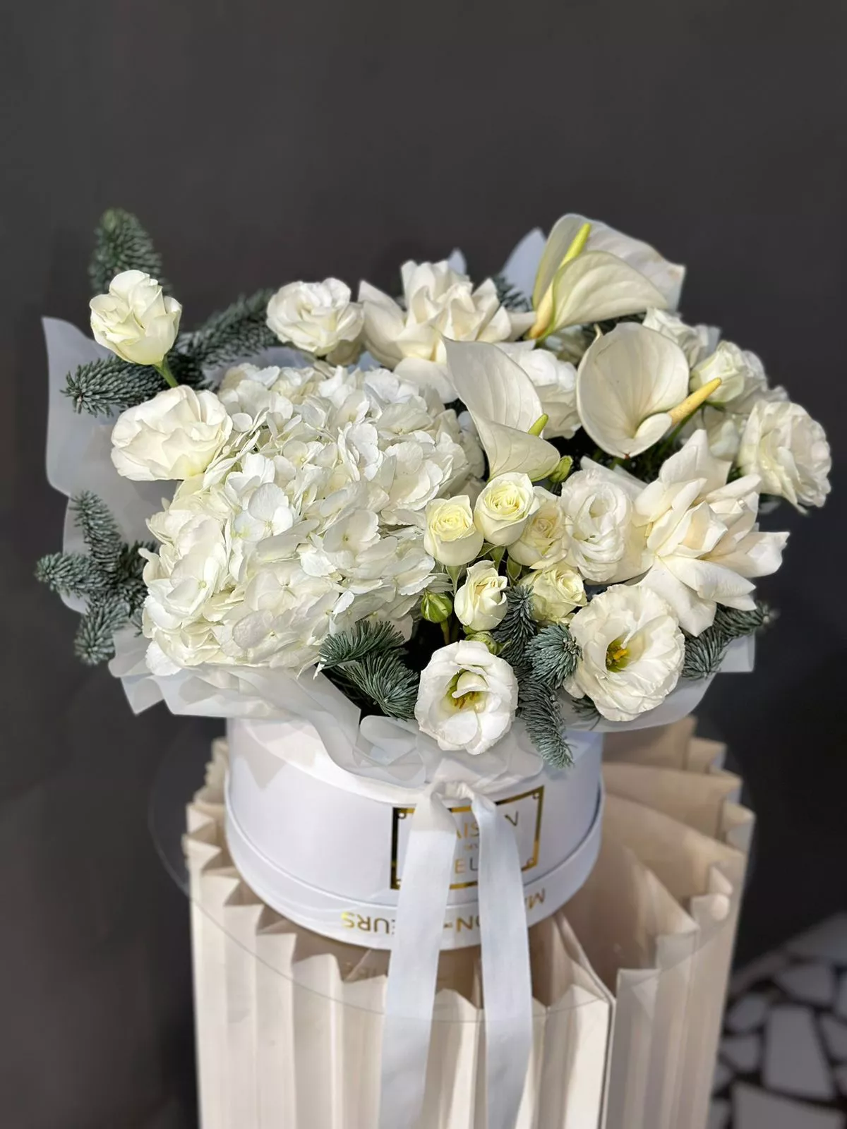 Антуриум (Голландия) - 3; Гортензия (Колумбия) - 1; Нобилис (Голландия) - 1; Роза голландская 60 см - 3; Спрей роза (Кения) - 1; Лизиантус (Израиль) - 3; Коробка Cтандартная (из комплекта 2в1) - 1; Открытка - 1;