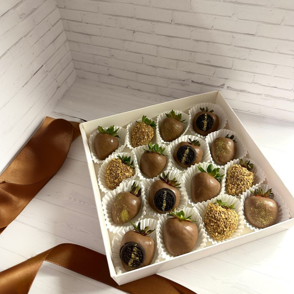 Свежая клубника в объятиях молочного шоколада, с декором из печенек. В этом сочетании терпкости и сладости каждый укус — невероятное приключение в мире вкуса.