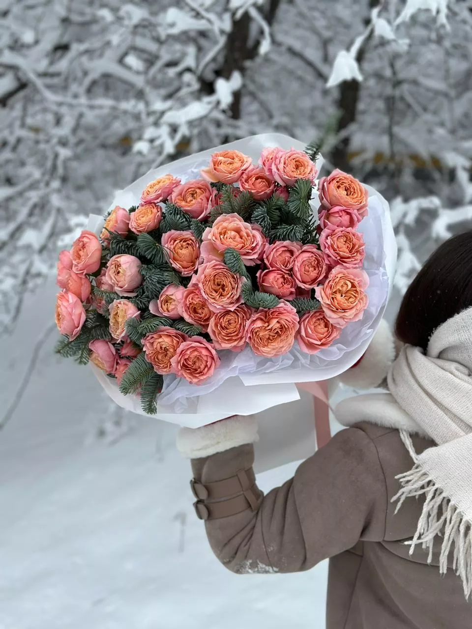 Пионовидные спрей розы в объятиях нежных веточек нобилиса создают неповторимую композицию, в которой красота и изысканность встречаются под волшебным покровом зимнего чуда. Этот букет призван подарить чувство тепла и восхищения в холодные дни, вдохновляя нежностью своих цветов и ароматом.