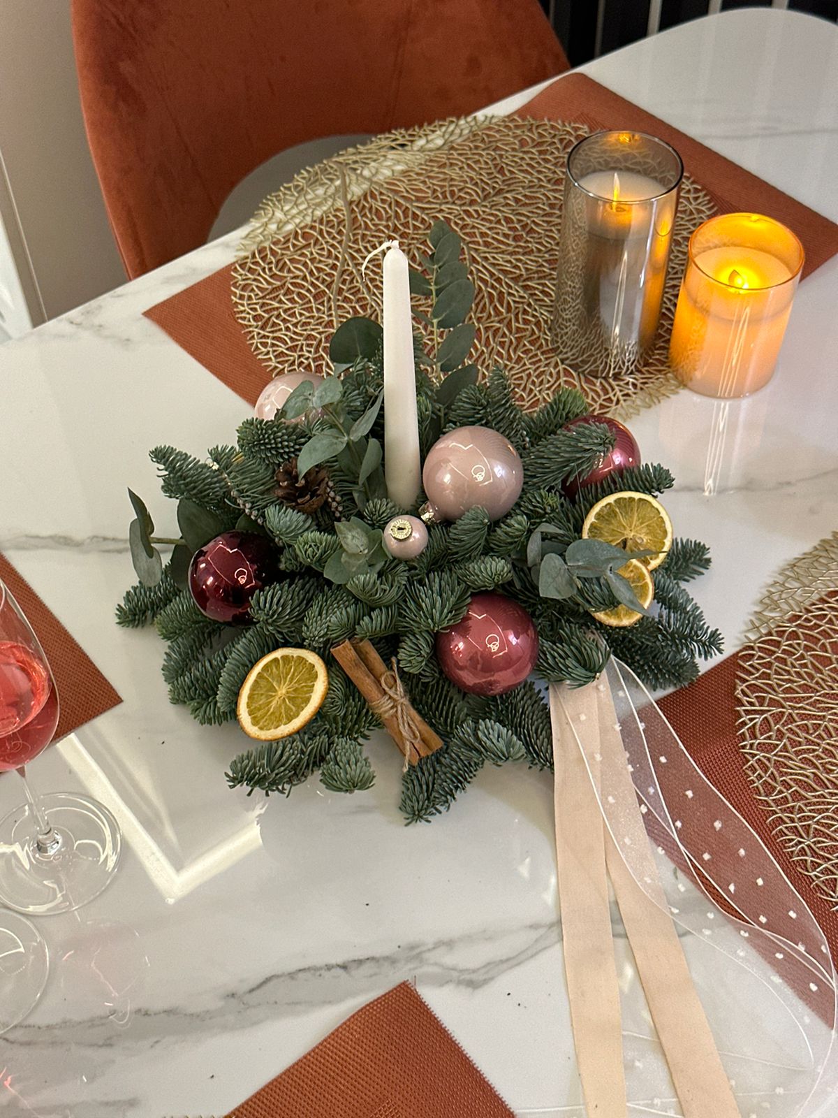 Завершите облик вашего стола композицией 'Season Wonders' — нобилис и шарики создают атмосферу настоящего праздника.