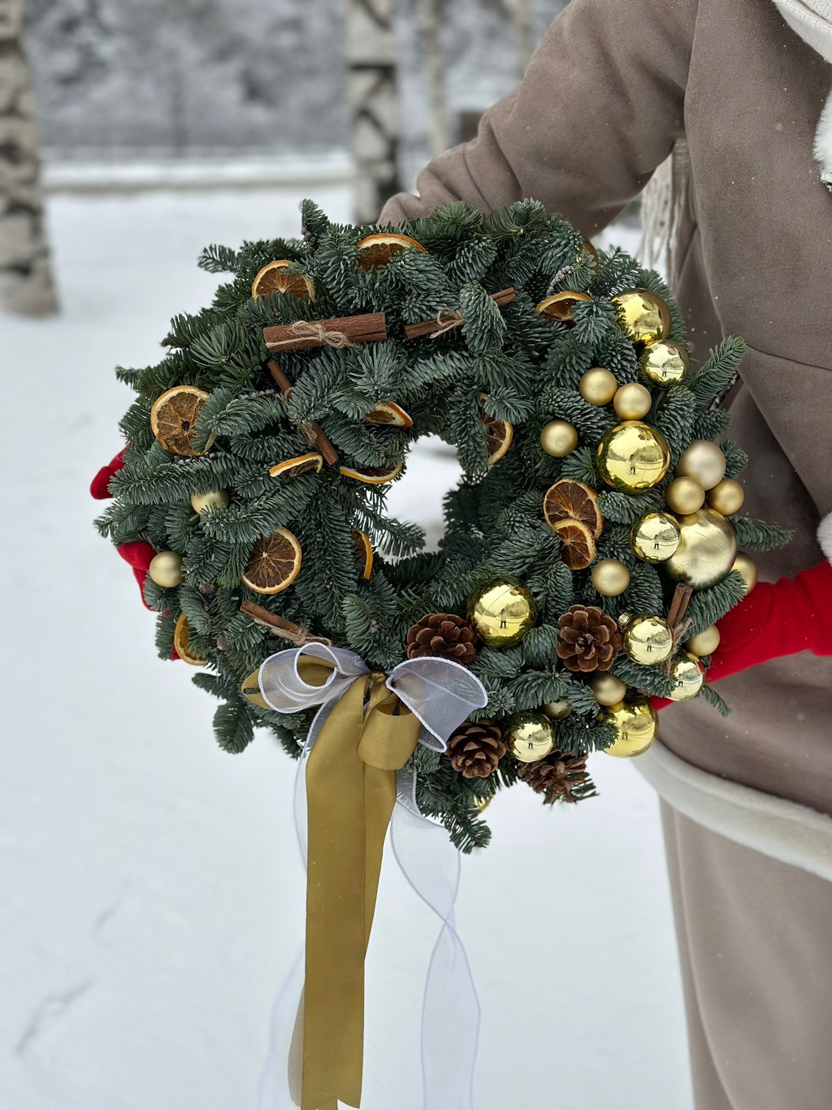 Венок "Golden Glitz" от ZakazBuketov это изысканное сочетание нобилиса, блеска золотых шариков, аромата корицы, естественных шишек и апельсинов. В каждой детали этого венка заключено волшебство зимнего праздника. Сияющий и ароматный, он приносит в дом уют и радость, напоминая о волшебной атмосфере новогоднего времени