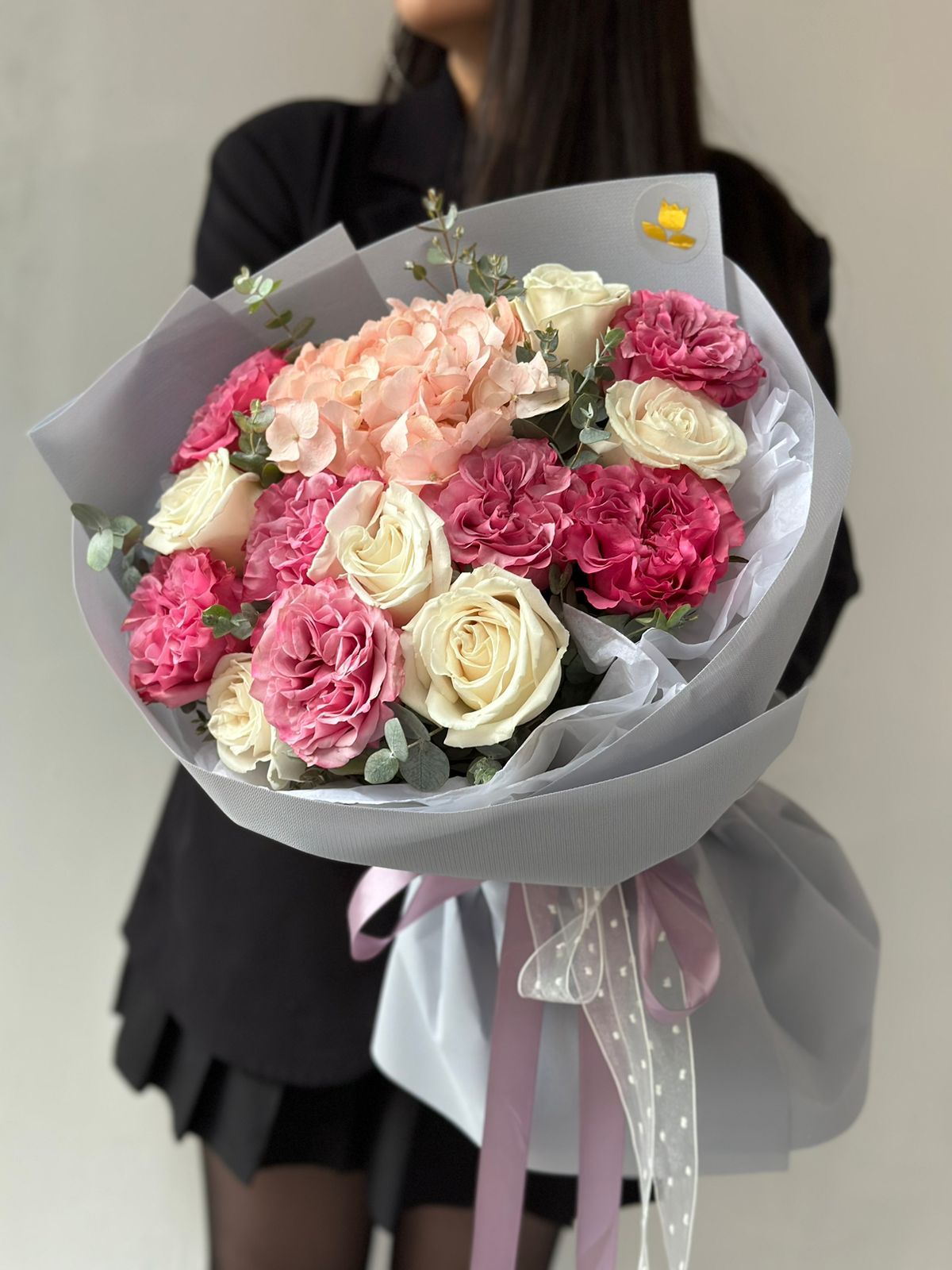Букет "Liana" от ZakazBuketov Этот букет, вобравший в себя нежные гортензии, изысканные розы и освежающие ветви эвкалипта, словно переносит вас в летний сад, где каждый цветок танцует под легким ветерком. Гортензии придают нежности, розы вносят роскошь, а эвкалипт добавляет свежесть и аромат. Этот букет — идеальное сочетание элегантности и легкости, создающее атмосферу тепла и уюта.