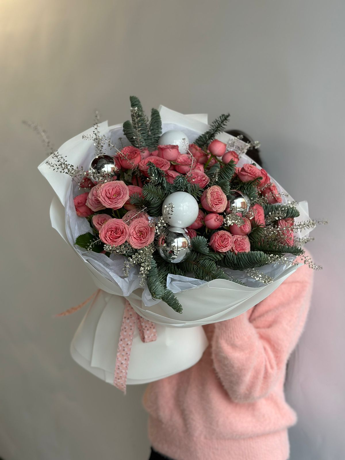 Букет "Зимнее волшебство" от ZakazBuketov Этот букет, состоящий из игривых спрей роз, мерцающих игрушек и благородного нобилиса, создает праздничный гармоничный ансамбль. Розы приносят свежесть и красоту, игрушки добавляют веселую ноту, а нобилис завершает композицию, создавая впечатление праздничной роскоши. Этот букет — визуальное воплощение радости и праздничного настроения.