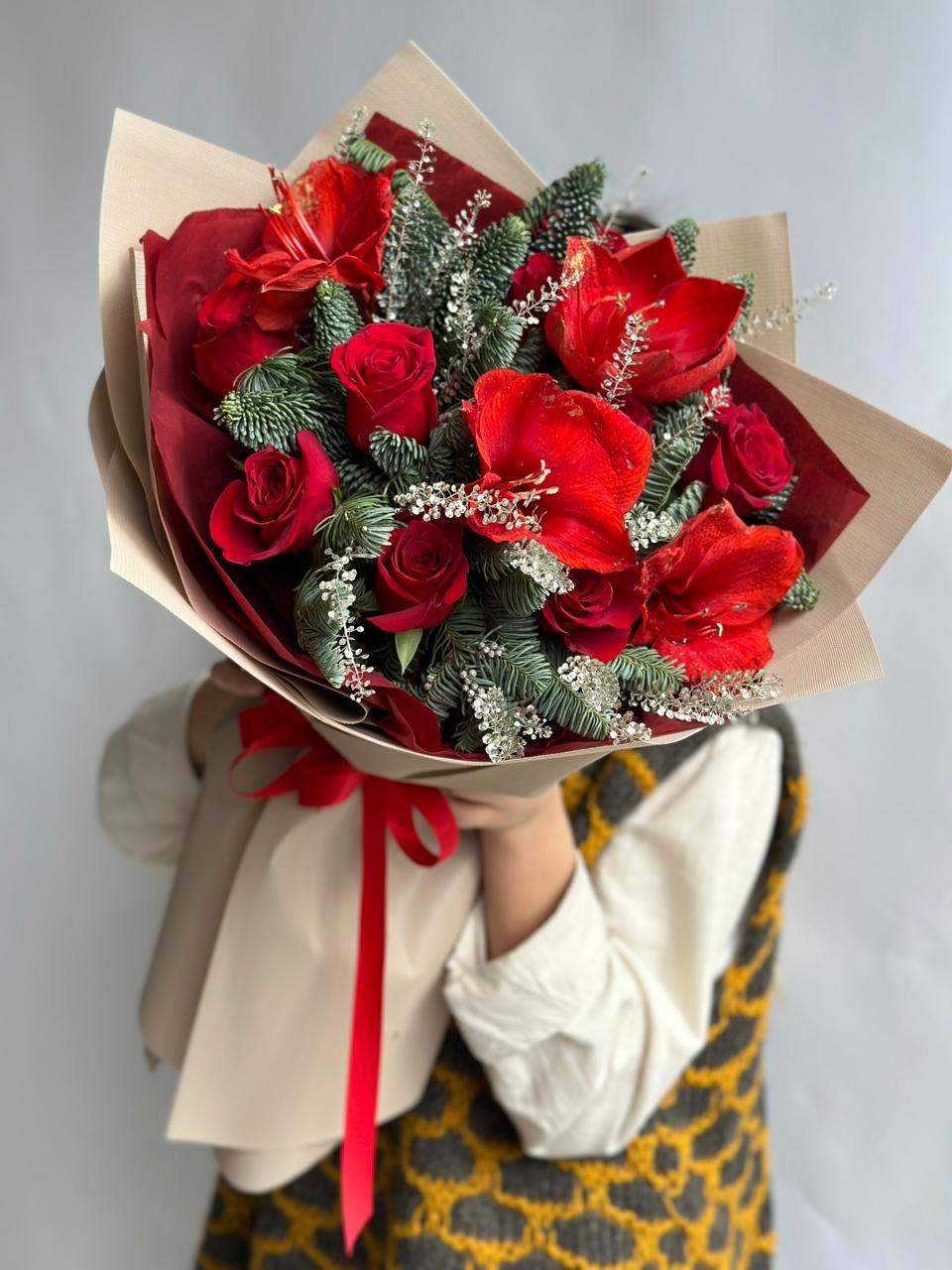 Букет "Новогодний фейерверк" от ZakazBuketov Этот праздничный букет, сочетающий в себе изысканные розы, элегантные амариллисы и благородный нобилис, является воплощением великолепия. Розы приносят романтику, амариллисы добавляют величественности, а нобилис создает атмосферу благородства и праздничной радости. Этот букет — идеальный подарок для особого случая, наполненный красотой и восхищением.