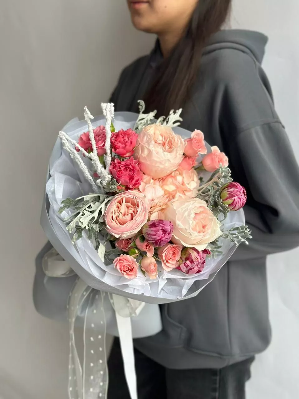Этот чарующий букет, состоящий из нежных гортензий, романтических роз и пышных пионов, создает настоящую зимнюю симфонию красок и форм. Гортензии придают легкости, розы добавляют роскоши, а пионы вносят в композицию ноты восхищения. Этот букет — яркое и эмоциональное воплощение радости и красоты.