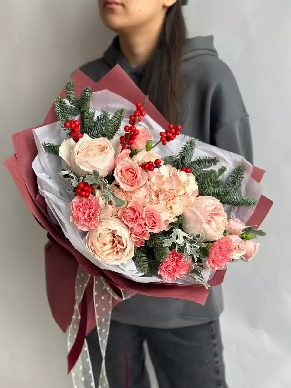 Композиция "Зимняя королева" Этот изысканный букет, объединяющий в себе нежные гвоздики, волшебные гортензии, роскошные розы и благородный нобилис, создает настоящую симфонию цветов. Этот букет — идеальное сочетание гармонии и разнообразия, подчеркивающее уникальность каждого цветка.