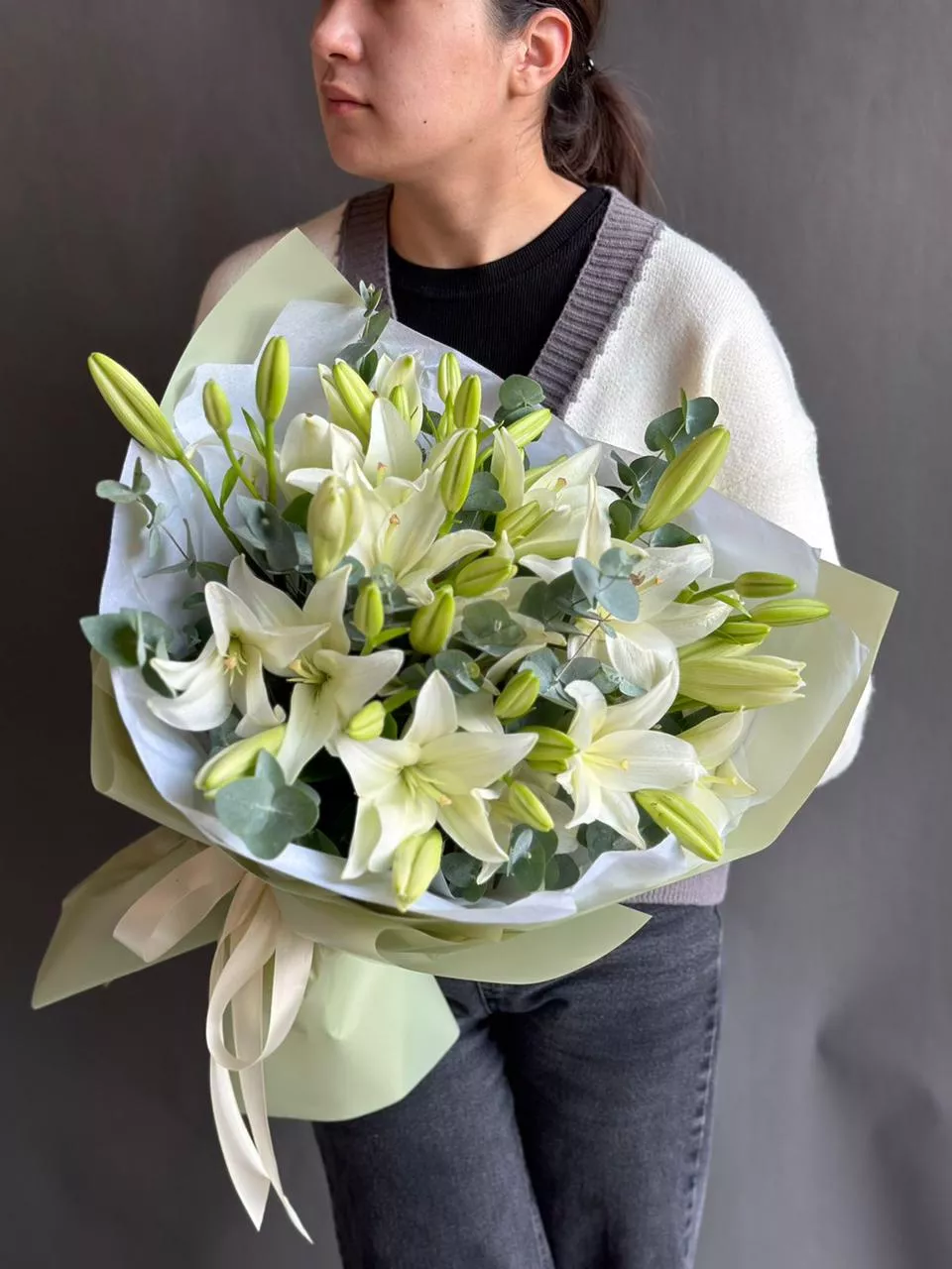 Лилия азиатка (Голландия) - 7; Эвкалипт (Голландия) - 1; Калька в ассортименте - 5; Открытка - 1;