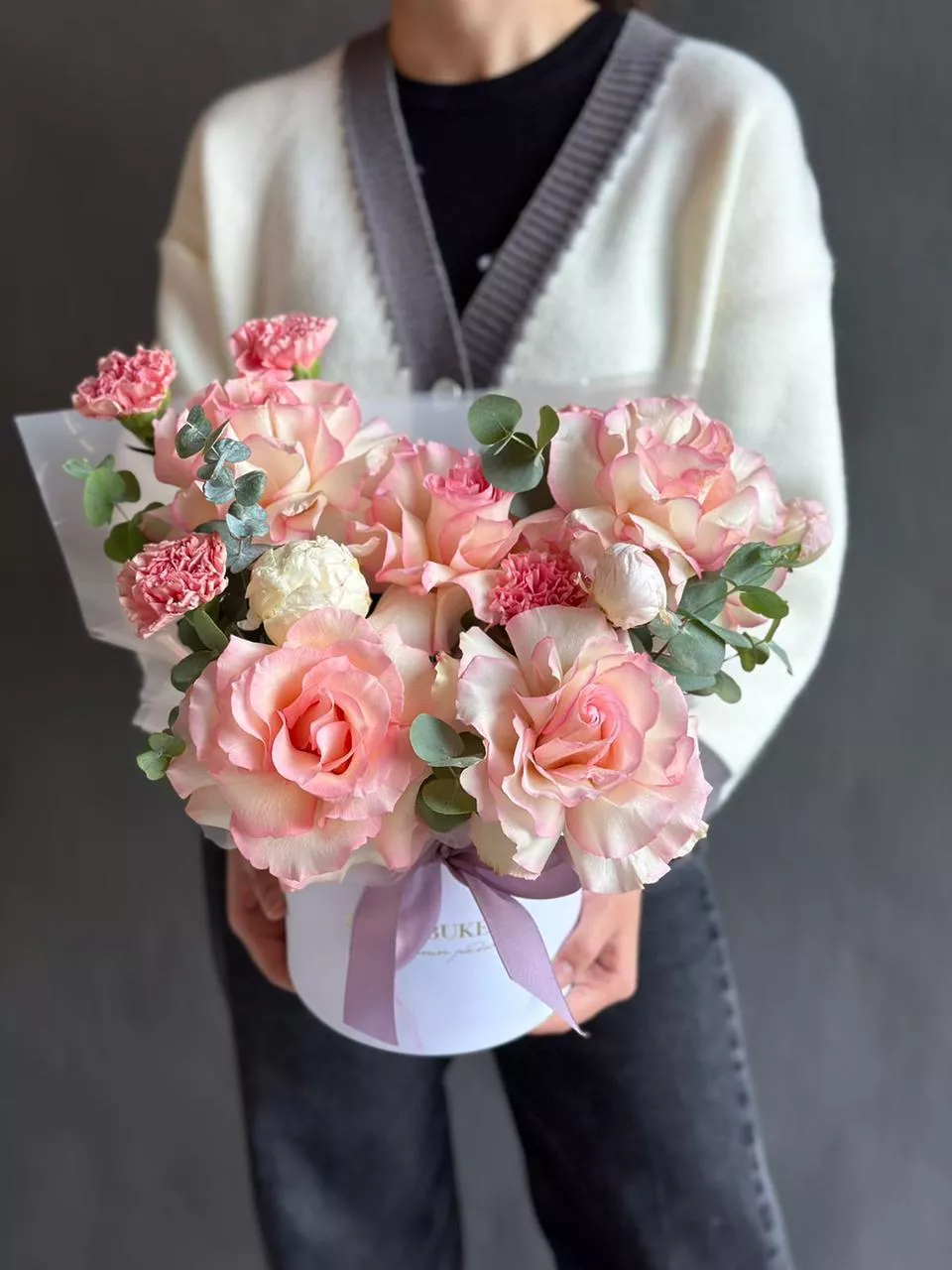 Роза голландская 60 см - 5; Гвоздика (Голландия) - 5; Эвкалипт (Голландия) - 0.5; Пион (Голландия) - 3; Коробка Cтандартная (из комплекта 2в1) - 1; Открытка - 1;