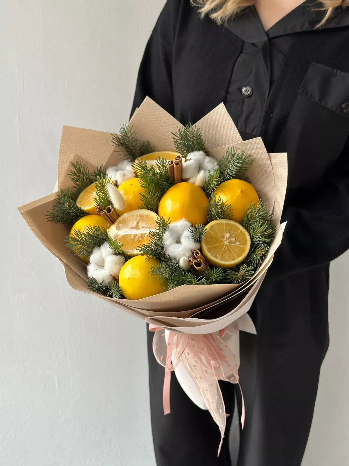 Фруктовый букет "Лимонка" от ZakazBuketov Букет из лимонов, хлопка и нобилиса — это свежий заряд энергии и яркий акцент стиля. Сочные лимоны, нежный хлопок и утонченный нобилис создают в этой композиции уникальное сочетание цветов и текстур. Этот букет приносит в дом свежесть цитрусовых и теплое ощущение уюта, создавая уникальную атмосферу.