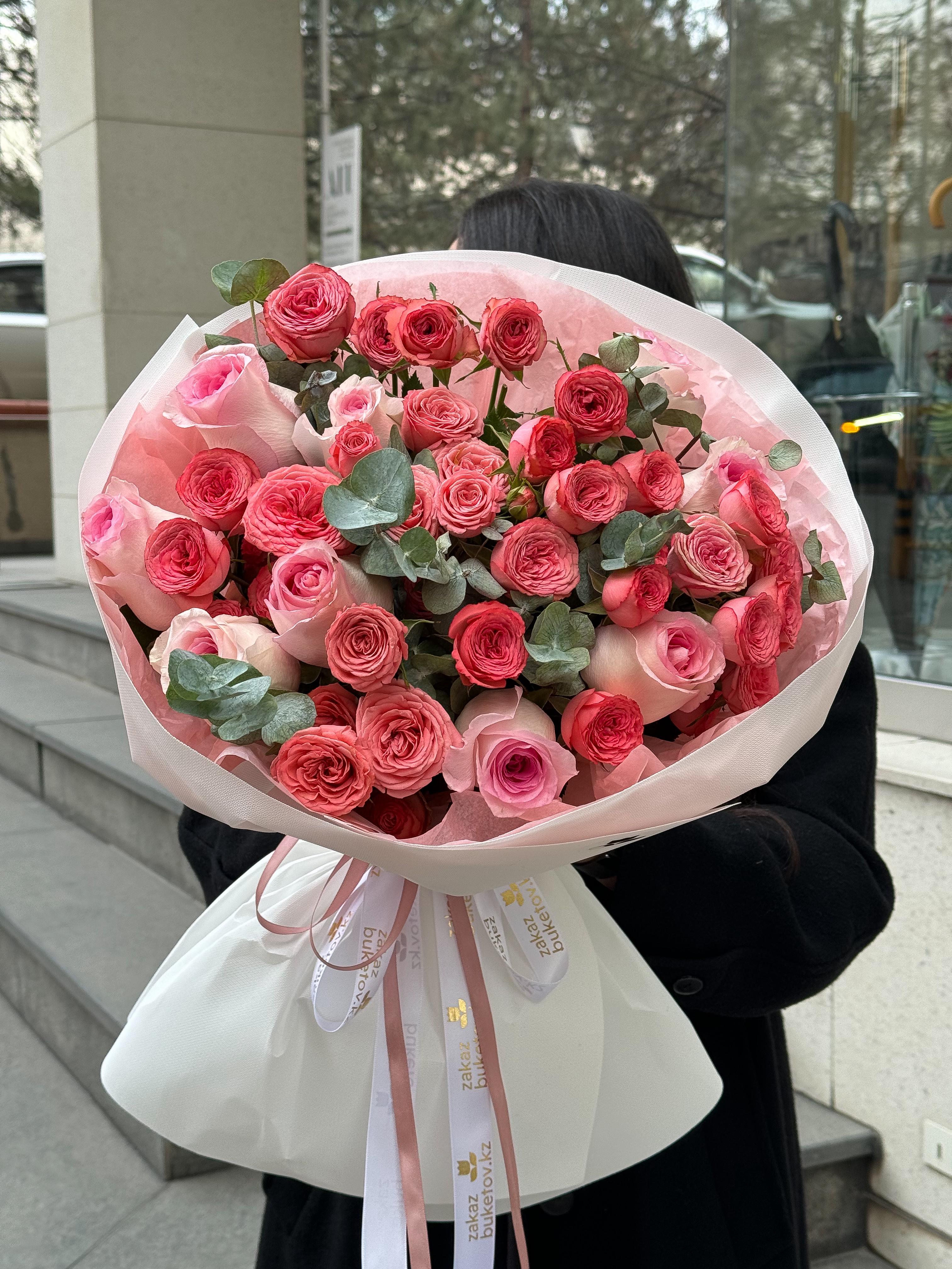 Букет "Волшебный сад" от ZakazBuketov Букет из розовых роз, пионовидных спрей роз и эвкалипта — это нежное и романтическое сочетание. Розовые розы придают букету нежный шарм, пионовидные розы добавляют пышности, а веточки эвкалипта создают освежающий акцент. Этот букет является воплощением изысканности и невесомой красоты.