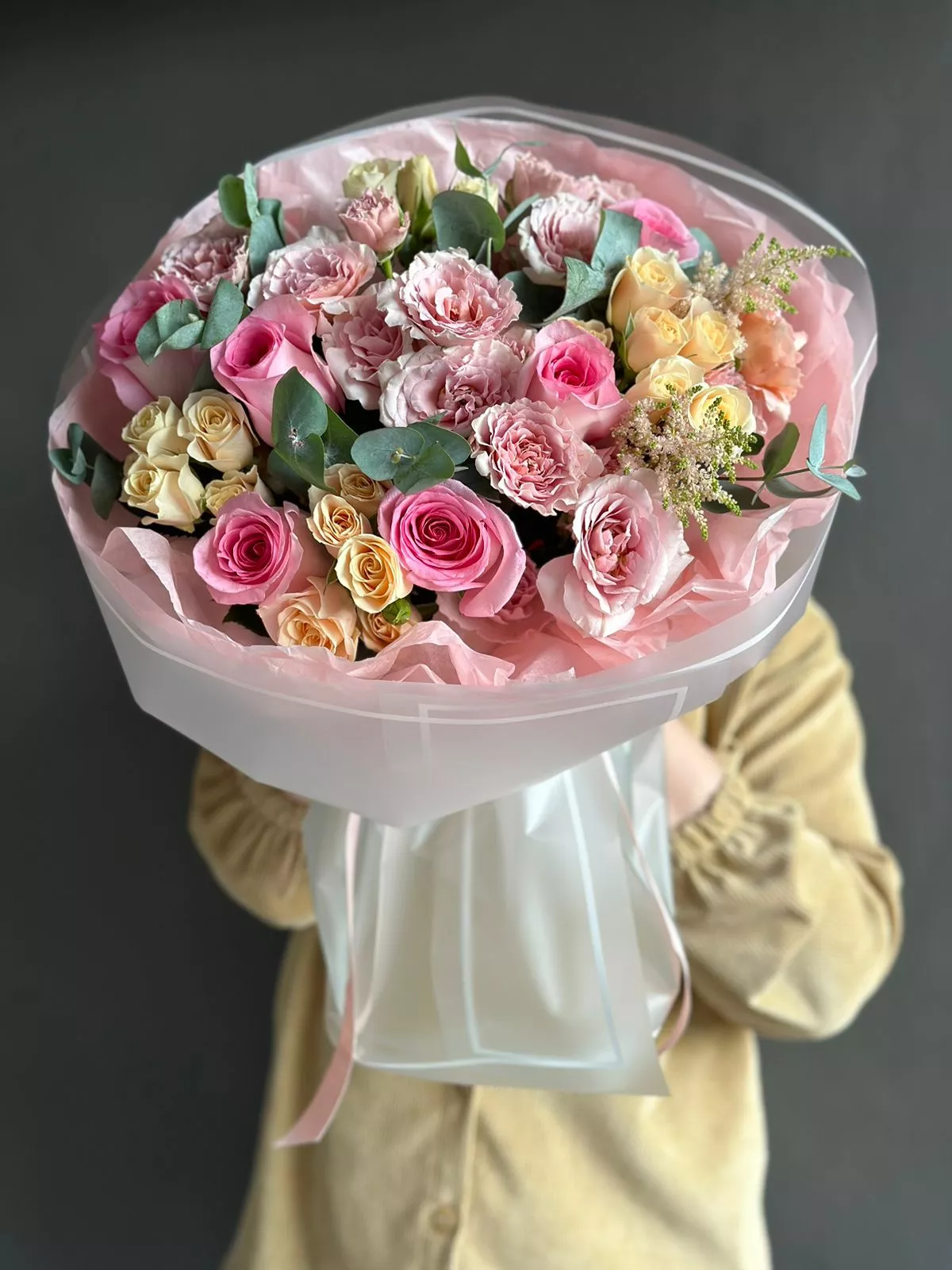Спрей роза (Кения) - 8; Астильба (Голландия) - 2; Роза голландская 60 см - 6; Эвкалипт (Голландия) - 1; Калька в ассортименте - 4; Открытка - 1;