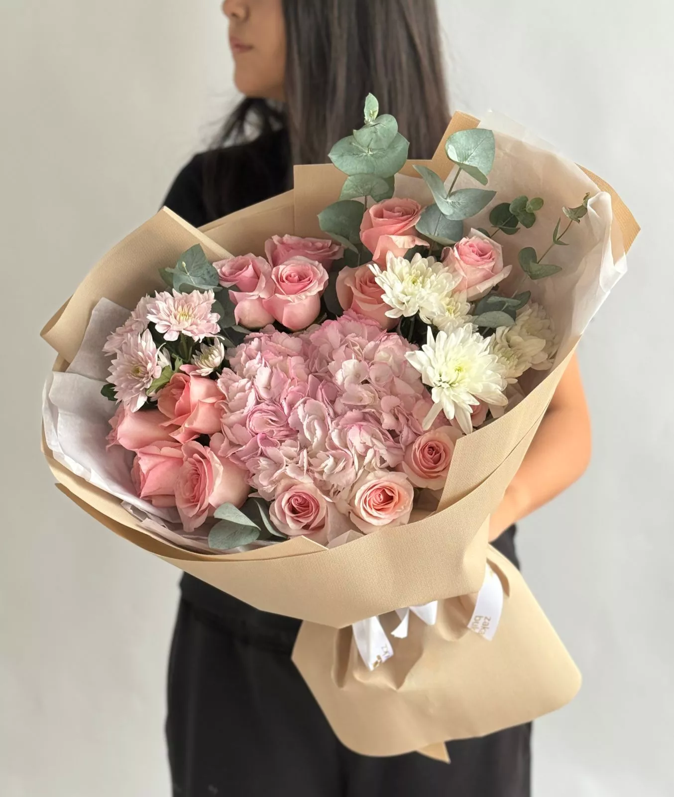 Хризантема кустовая (Голландия) - 2; Гортензия (Колумбия) - 1; Эвкалипт (Голландия) - 1; Роза голландская 60 см - 15; Калька в ассортименте - 4; Открытка - 1;