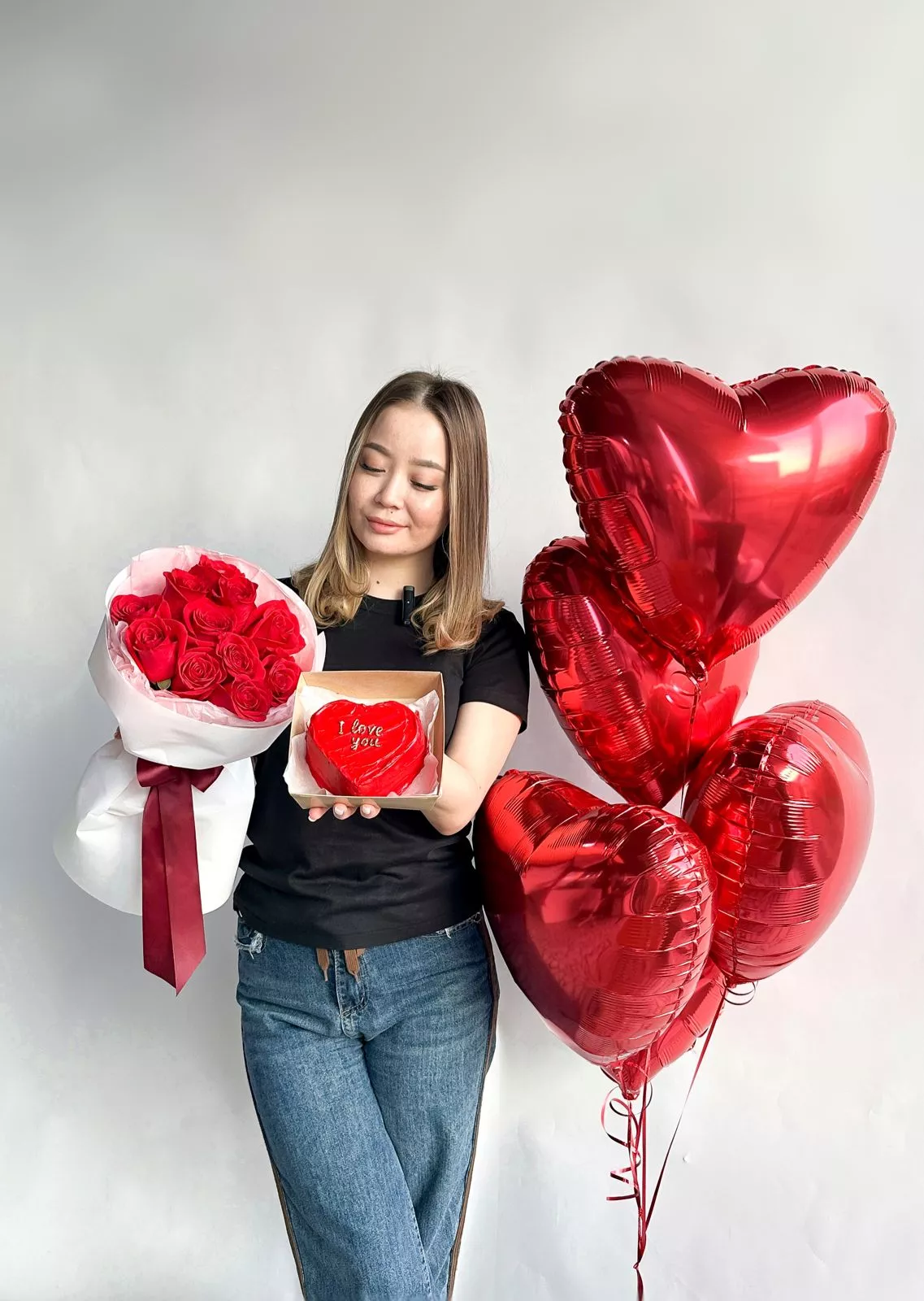Букет красных роз — символ страсти и вечной любви, который подчеркнет вашу преданность и восхищение. Ароматный бенто тортик, украшенный заботливыми деталями, станет сладким дополнением к вашим эмоциям. Воздушные шары в форме сердца поднимут ваши чувства на новую высоту, наполнив воздух магией любви.