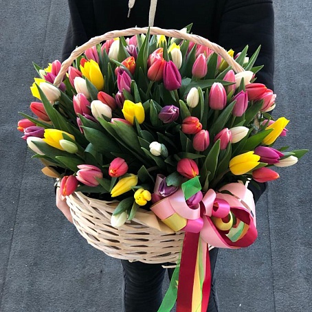 Букет из 101 тюльпана разных цветов в корзине — это весеннее торжество красок и жизни. Каждый тюльпан вносит свою уникальную нотку яркости и радости, создавая впечатление веселой и красочной композиции. Этот букет является прекрасным символом оптимизма и свежести, идеальным для подарка на особый день или для создания праздничного настроения в любом месте.