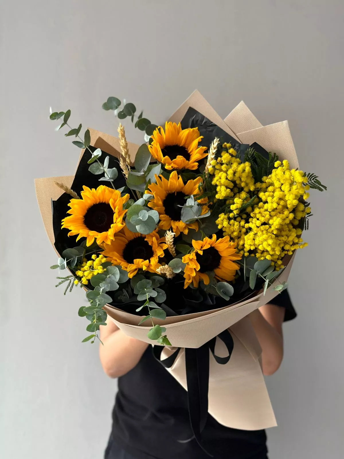 Подсолнух (Голландия) - 5; Мимоза (Голландия) - 2; Эвкалипт (Голландия) - 2; Пшеница (Голландия) - 1; Калька в ассортименте - 4; Открытка - 1;