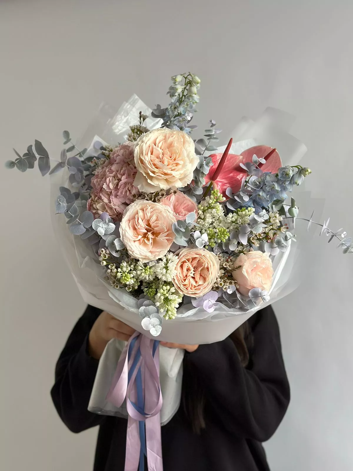 Пионовидная роза (Англия) - 5; Антуриум (Голландия) - 2; Дельфиниум (Голландия) - 2; Сирень (Голландия) - 2; Гортензия (Голландия) - 1; Вакс (Голландия) - 1; Эвкалипт (Голландия) - 1; Калька в ассортименте - 4; Открытка - 1;