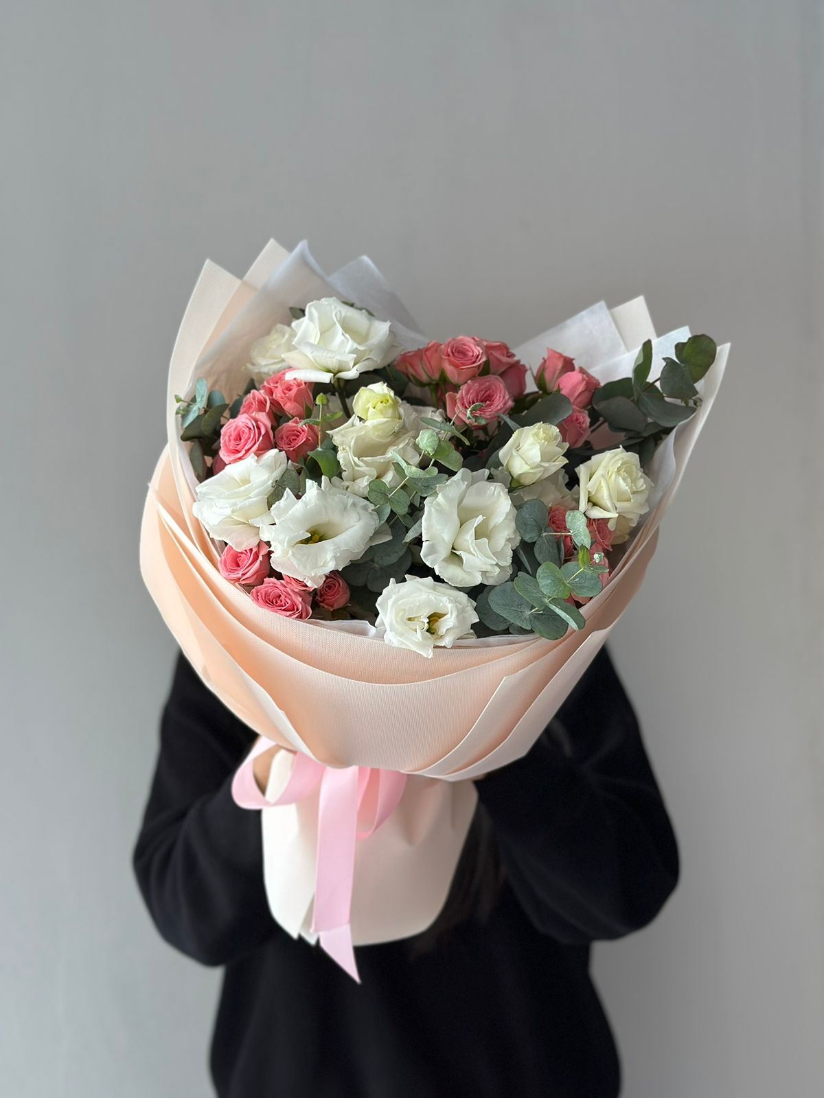 Букет "Greta" из лизиантусов, спрей-роз и эвкалипта - это изысканное сочетание нежности и свежести. Каждый элемент этого букета приносит в пространство свою уникальную атмосферу: лизиантусы - элегантность и изящество, спрей-розы - романтику и красоту, а эвкалипт - свежесть и аромат природы. "Greta" создан для того, чтобы подарить яркие эмоции и внести нотки изысканности в особые моменты жизни.