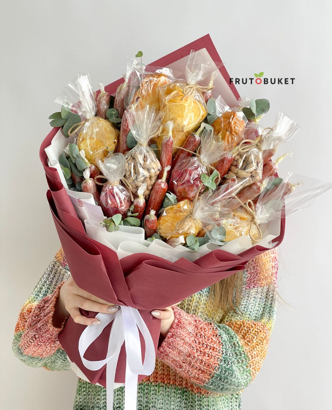 Мужской букет из колбасок, чипсов и орешков - это оригинальное и веселое сочетание вкусных угощений, которое придется по вкусу многим мужчинам. Этот букет станет приятным сюрпризом для любого праздника или момента, когда нужно подарить радость и улыбку.
