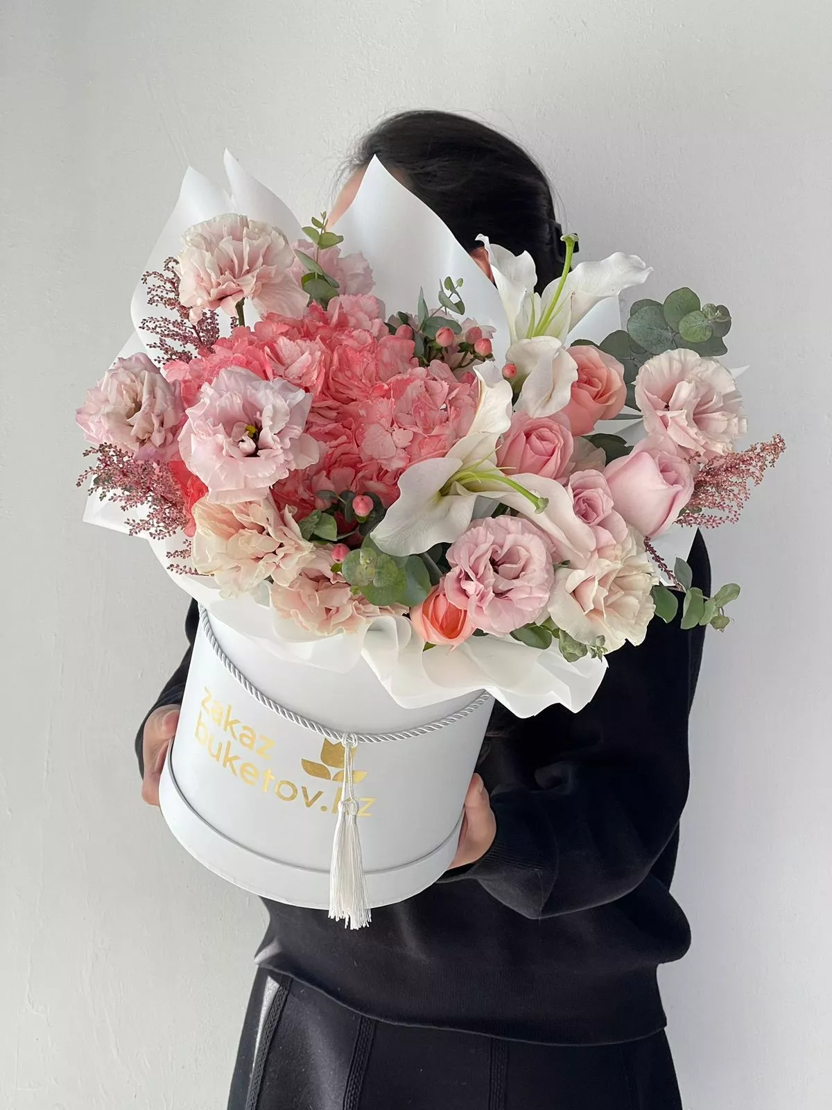 Лилия азиатка (Голландия) - 2; Гортензия (Колумбия) - 1; Роза голландская 60 см - 5; Астильба (Голландия) - 3; Гипперикум (Голландия) - 2; Лизиантус (Израиль) - 3; Коробка Cтандартная (из комплекта 2в1) - 1; Открытка - 1;