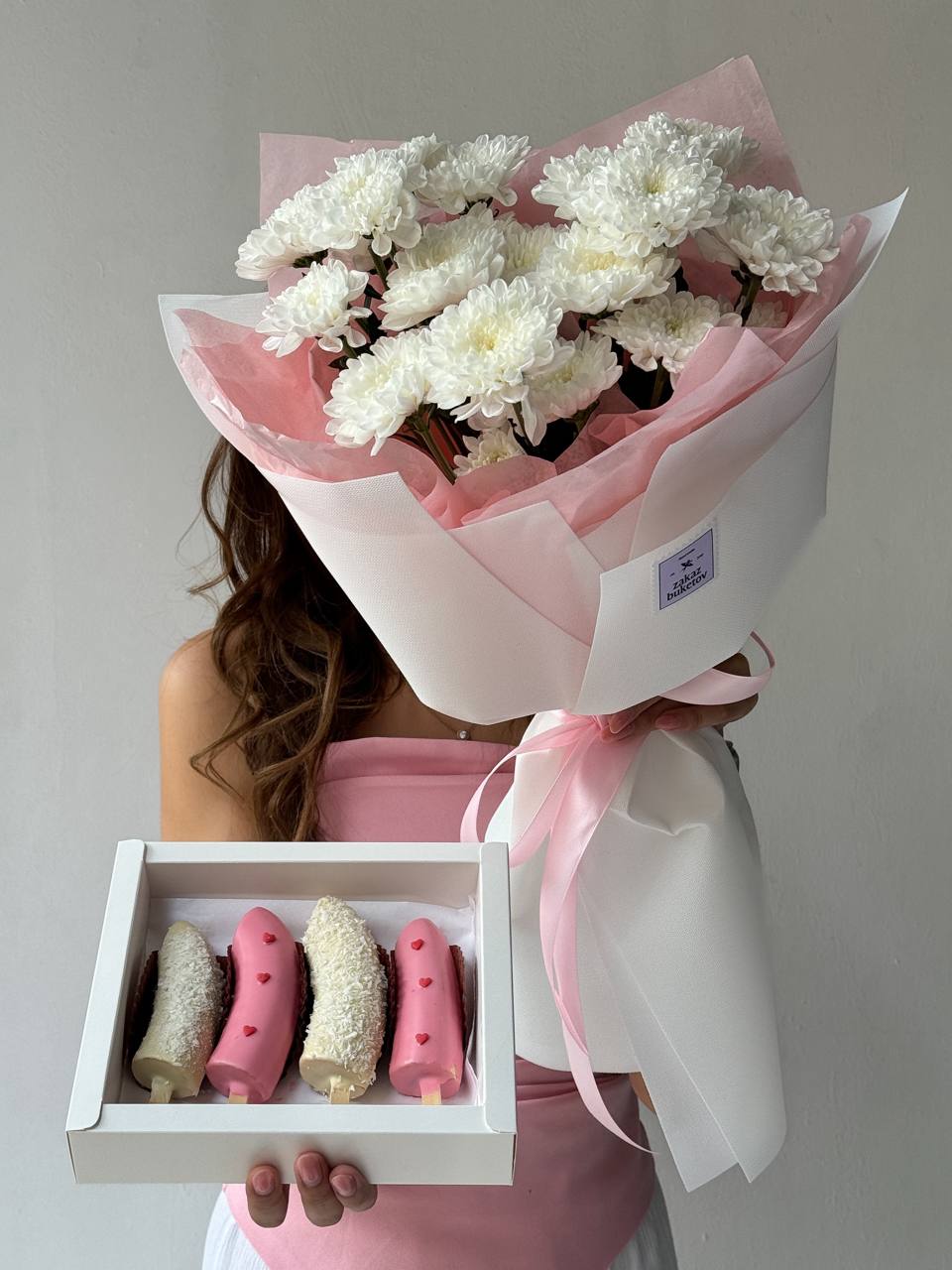 Хризантема кустовая (Голландия) - 3; Калька в ассортименте - 4; Открытка - 1; Банан в шоколаде большой - 4; Коробочка для клубники - 1;