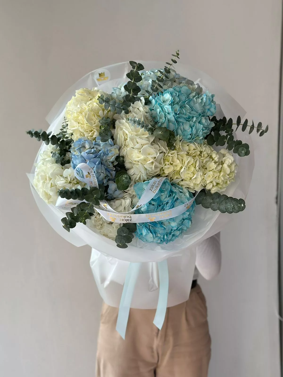 Букет из гортензий и эвкалипта — это нежное сочетание пышных соцветий гортензии и зелёных листьев эвкалипта.
