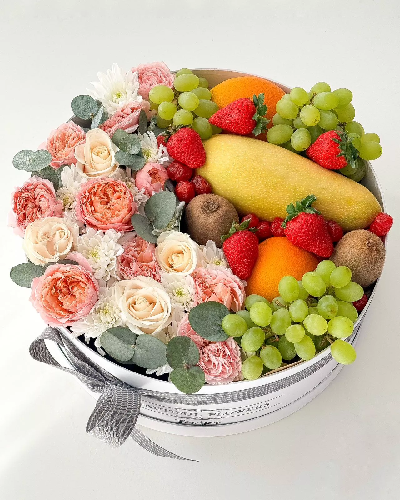 Фруктово-цветочная коробка "Gentle Whisper" из роз, хризантем и тропических фруктов
