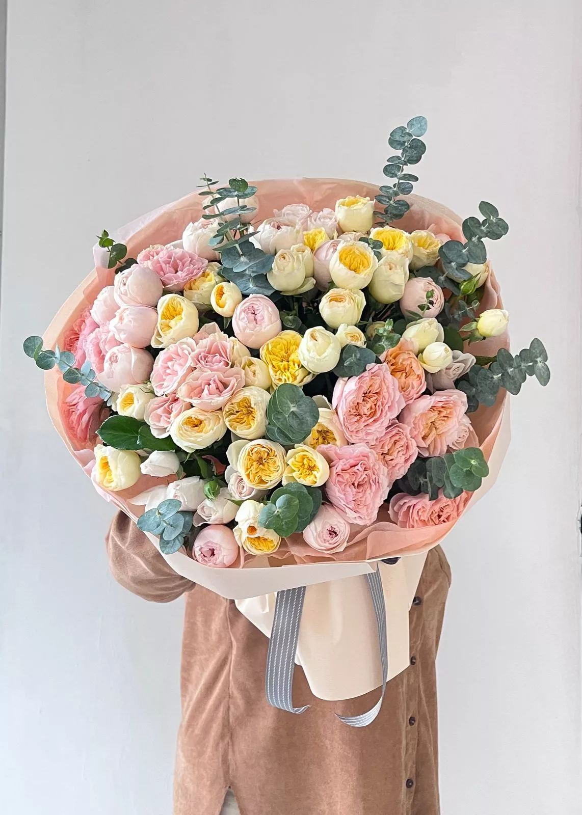 Букет из спрей-роз, пионовидных спрей-роз и эвкалипта — это нежное сочетание миниатюрных роз, напоминающих пионы, и свежих веточек эвкалипта. Такая композиция подарит весеннюю свежесть и изысканную красоту вашему дому.