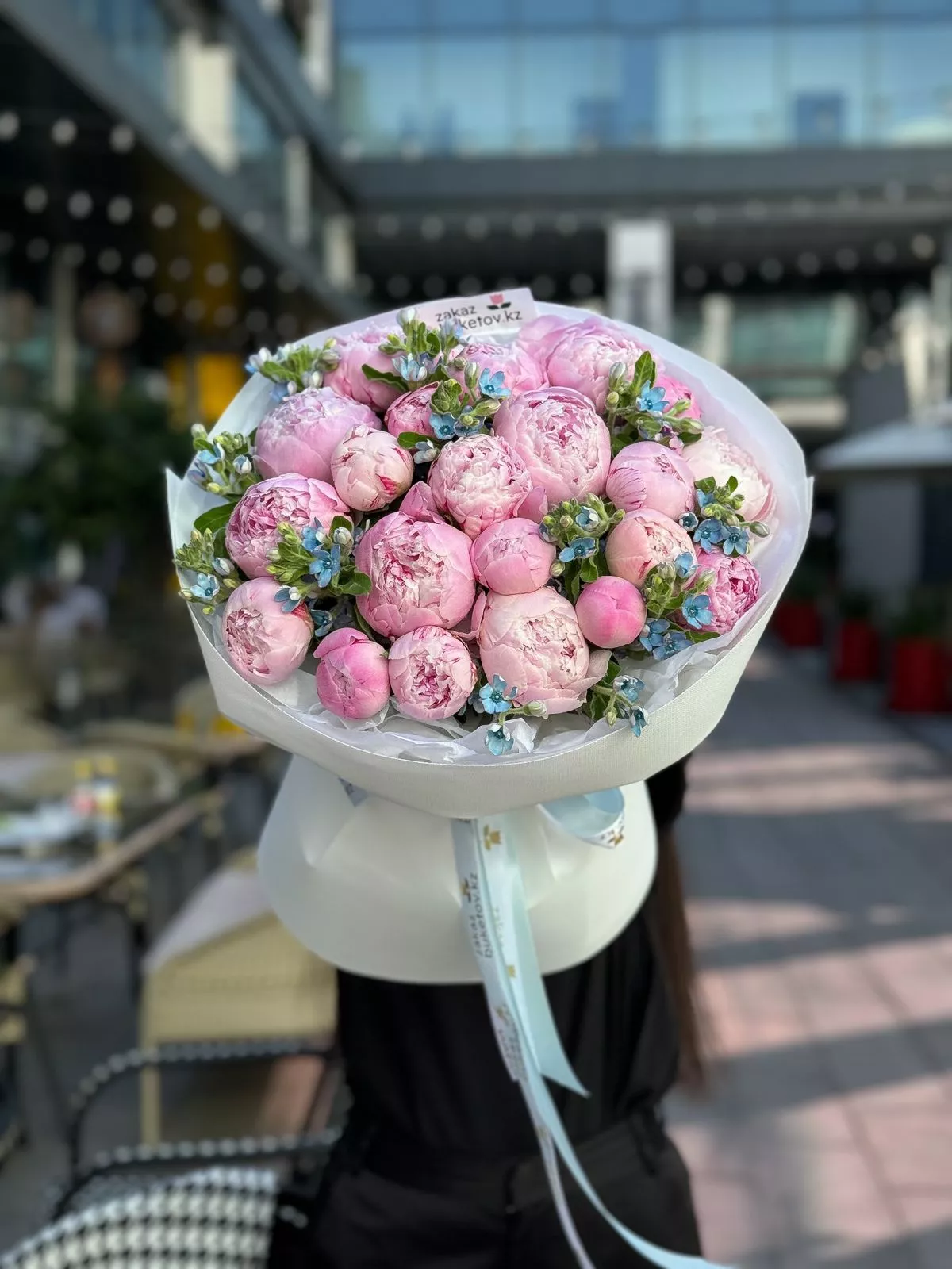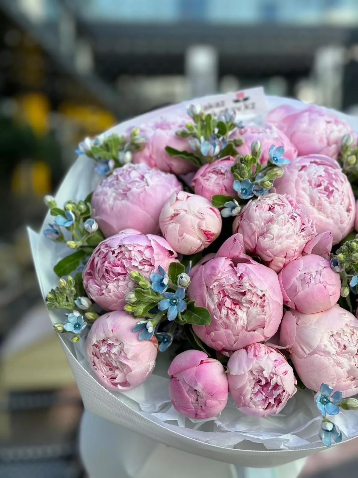 Голландские пионы и твидия — идеальное сочетание для создания пышного и яркого букета.
