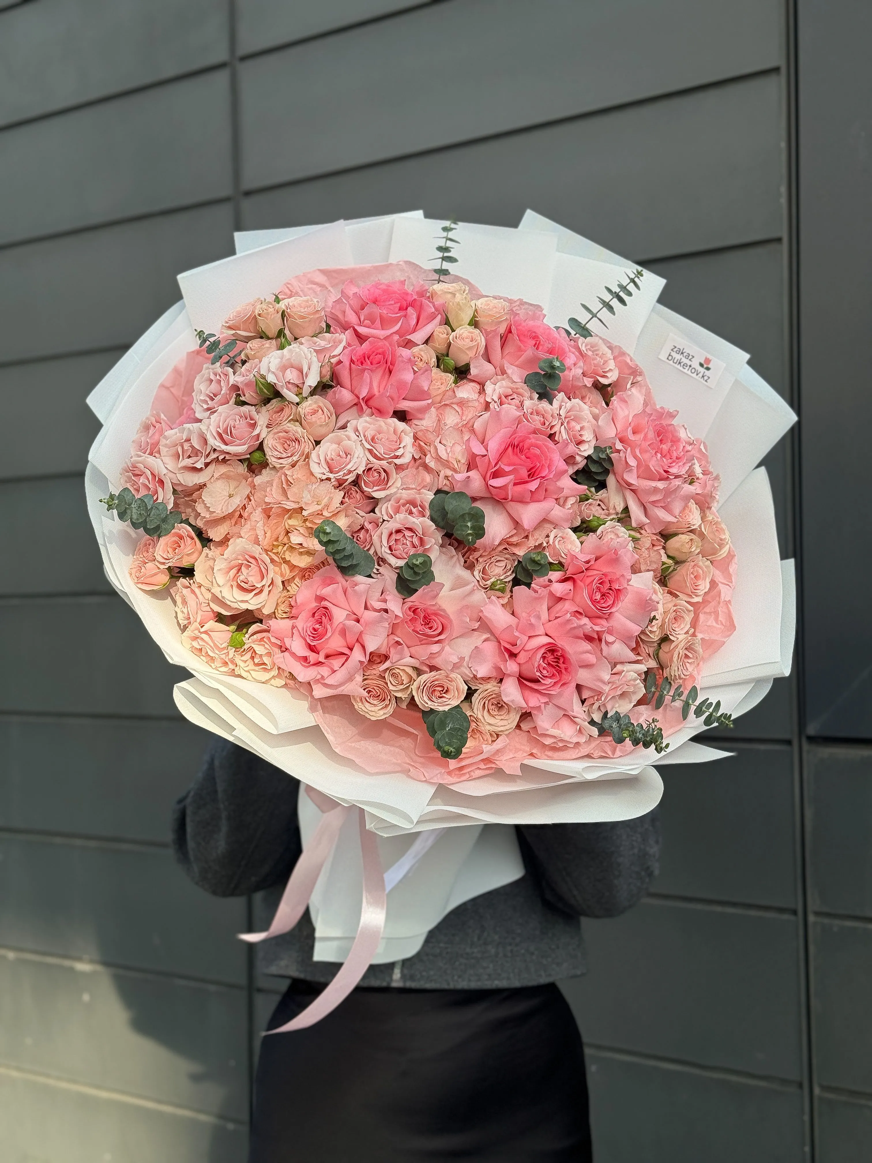 Букет из гортензий и роз — это изысканное сочетание нежности гортензий и страсти роз, создающее атмосферу романтики и гармонии.