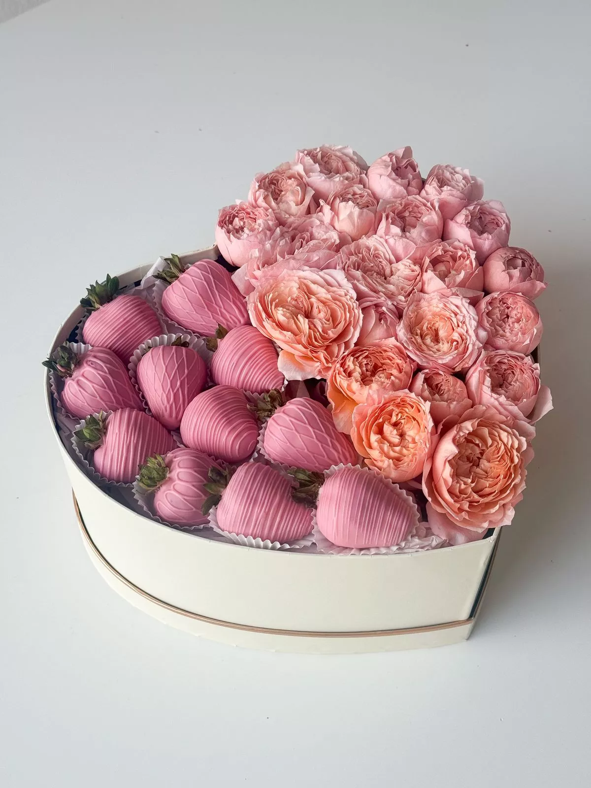 Спрей роза пионовидная (Кения) - 4; Клубника в шоколаде - 11; Коробка сердце - 1; Открытка - 1;
