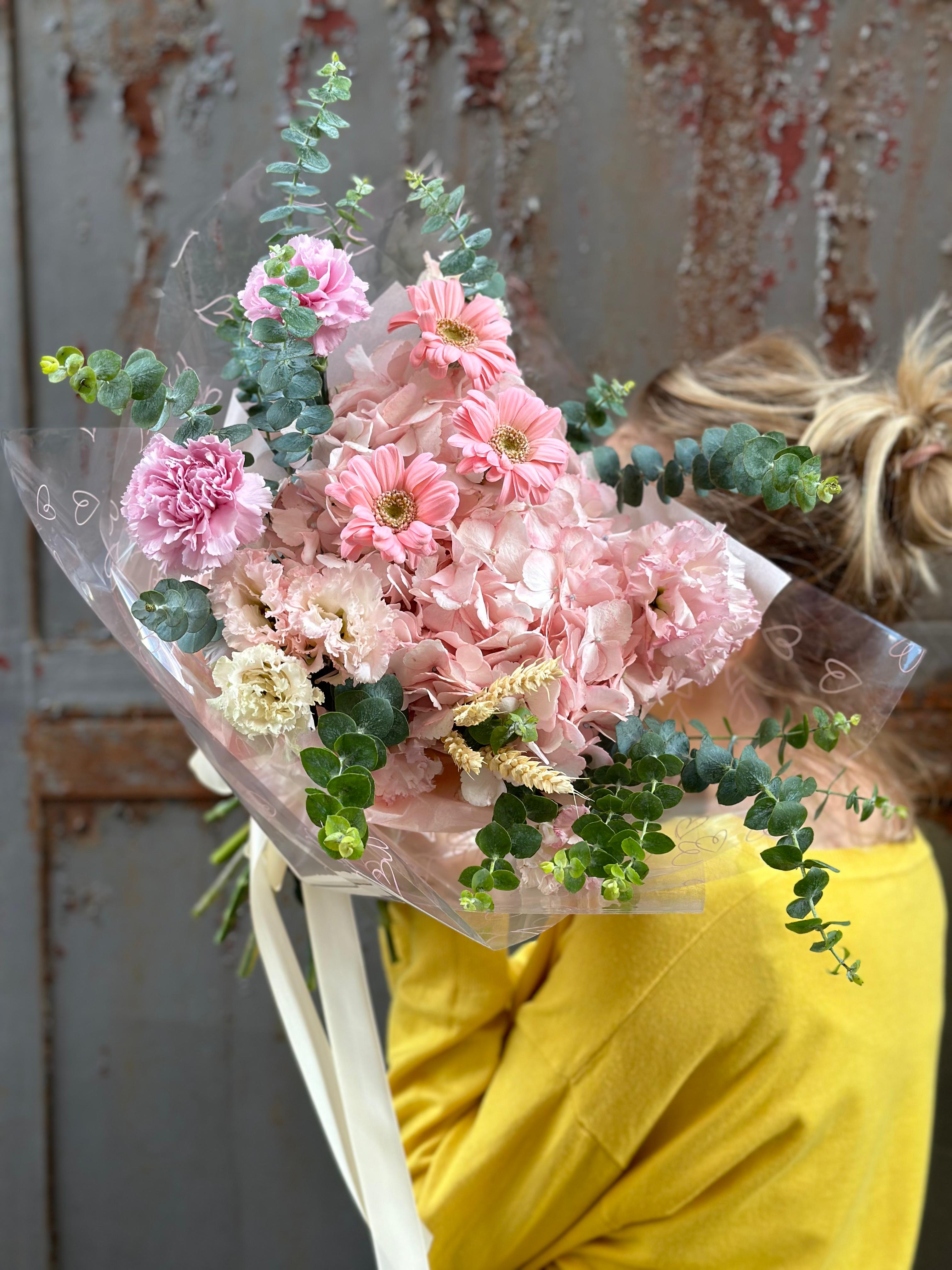 Букет из розовых гвоздик, гербер и лизиантусов — идеальный выбор для тех, кто хочет порадовать близких изысканным и стильным подарком.