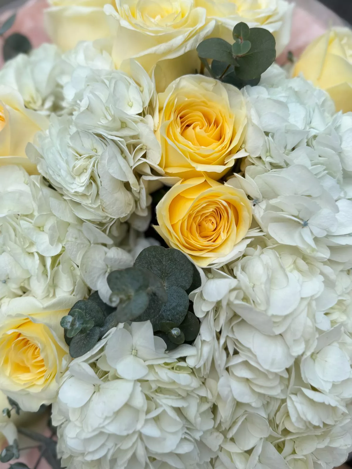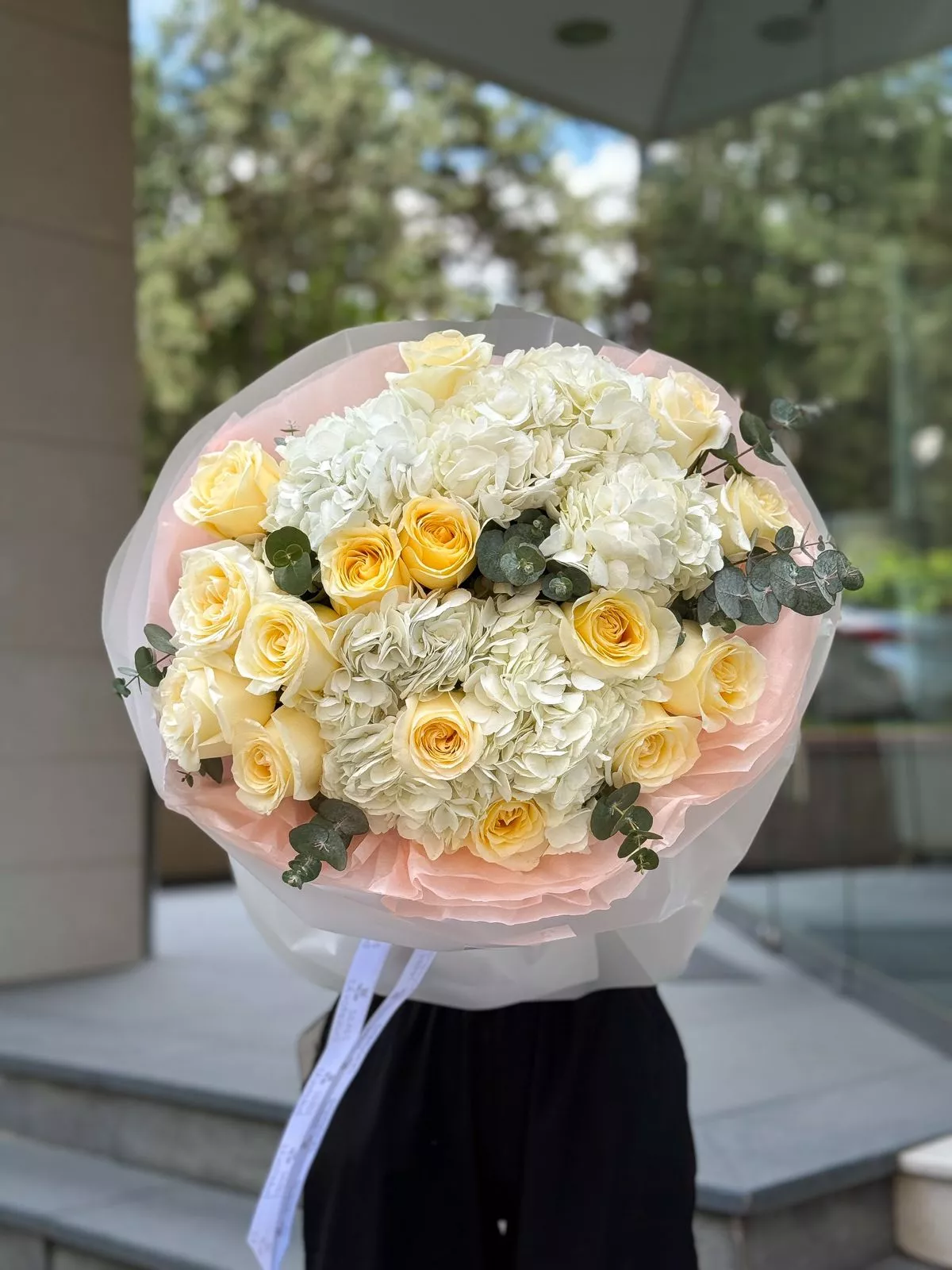 Букет из гортензий и роз — это изысканное сочетание нежности гортензий и страсти роз. Гортензии добавляют букету воздушность и лёгкость, а розы — элегантность и роскошь. Такой букет станет прекрасным подарком для любимых и близких людей.
