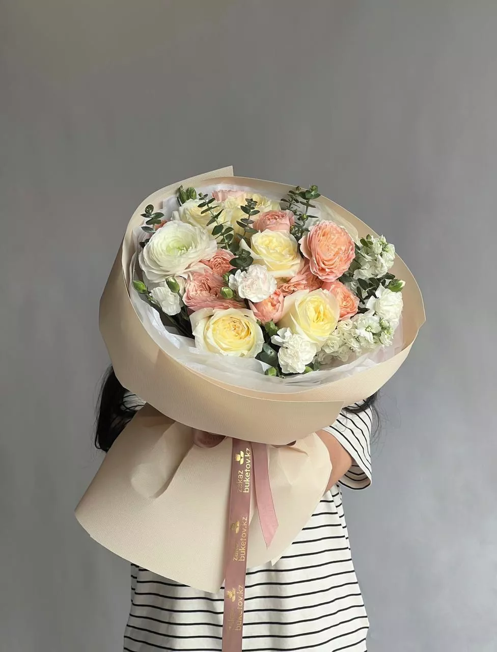 Роза голландская 60 см - 6; Спрей роза пионовидная (Кения) - 2; Эвкалипт (Голландия) - 1; Маттиола (Голландия) - 1; Ранункулюс (Голландия) - 1; Гвоздика (Голландия) - 5; Калька в ассортименте - 5; Открытка - 1;