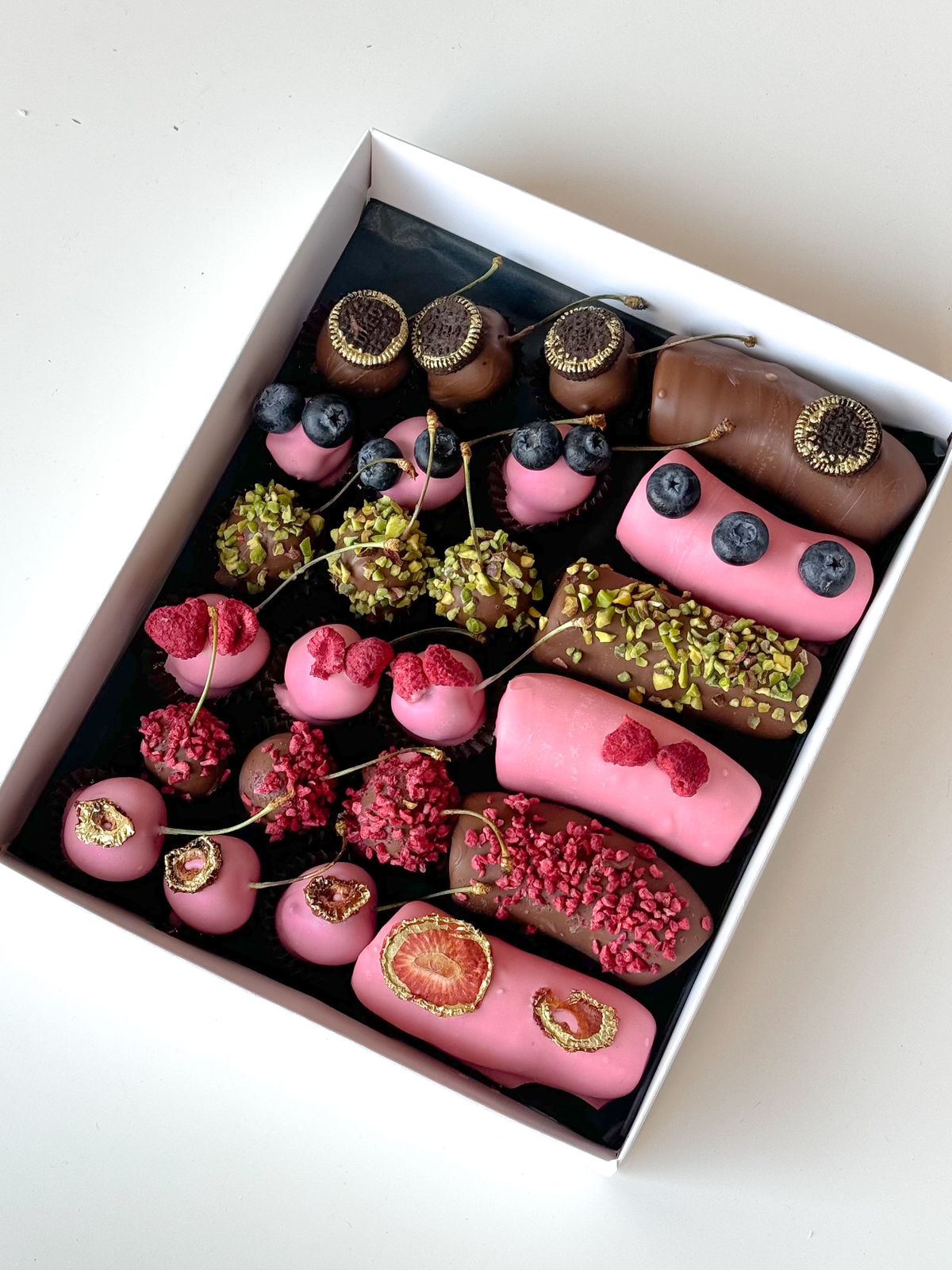 Черешня в шоколаде - 18; Банан в шоколаде большой - 6; Коробочка для клубники - 1; Открытка - 1; Ягодный декор - 1;