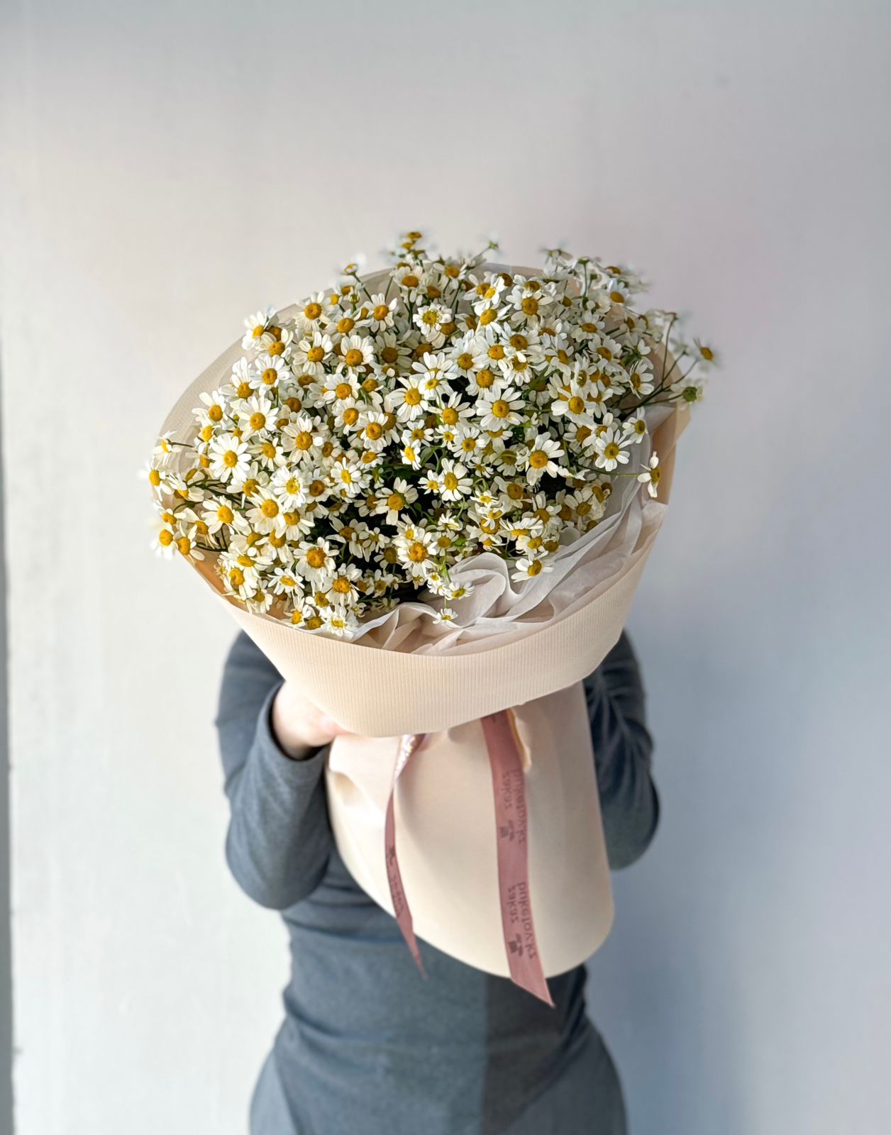Букет «Доброе пожелание» состоит из кустовых ромашек, символизирующих солнце, радость и счастье. Эти нежные цветы станут отличным подарком для ваших близких и друзей, чтобы пожелать им добра и благополучия.