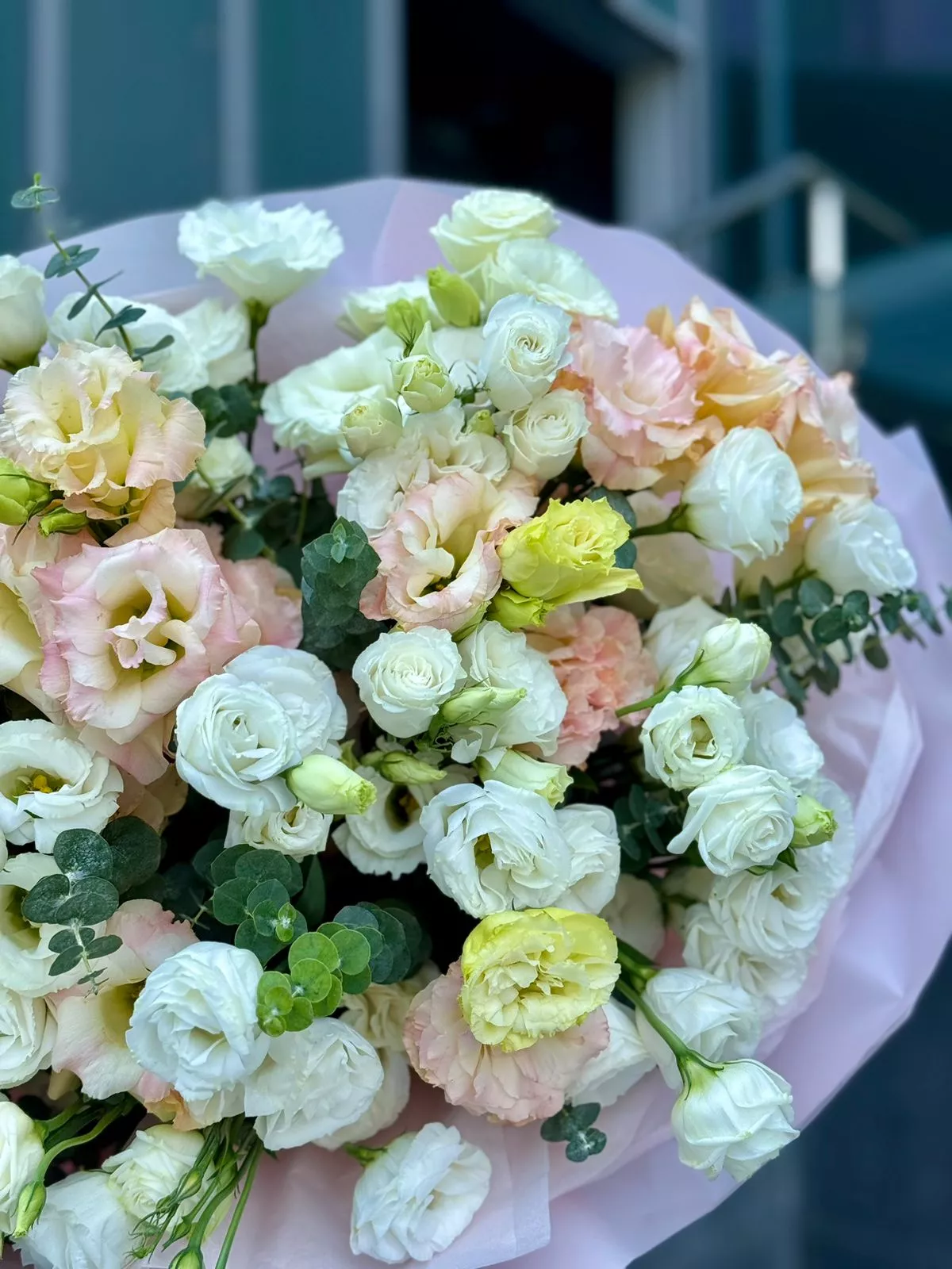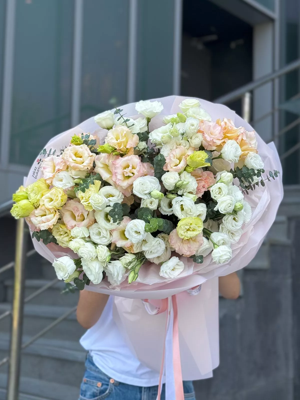 Букет "Афродита" от ZakazBuketov Букет из лизиантусов и эвкалипта — это нежное сочетание, которое подойдёт для любого случая.