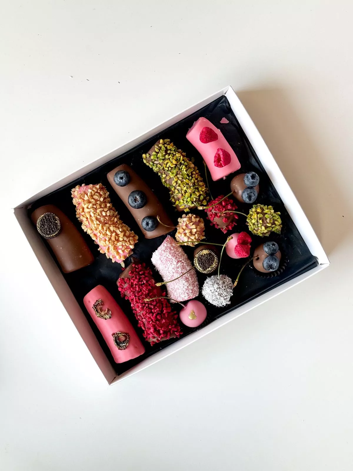 Банан в шоколаде большой - 8; Черешня в шоколаде - 9; Открытка - 1; Коробочка для клубники - 1; Ягодный декор - 1;