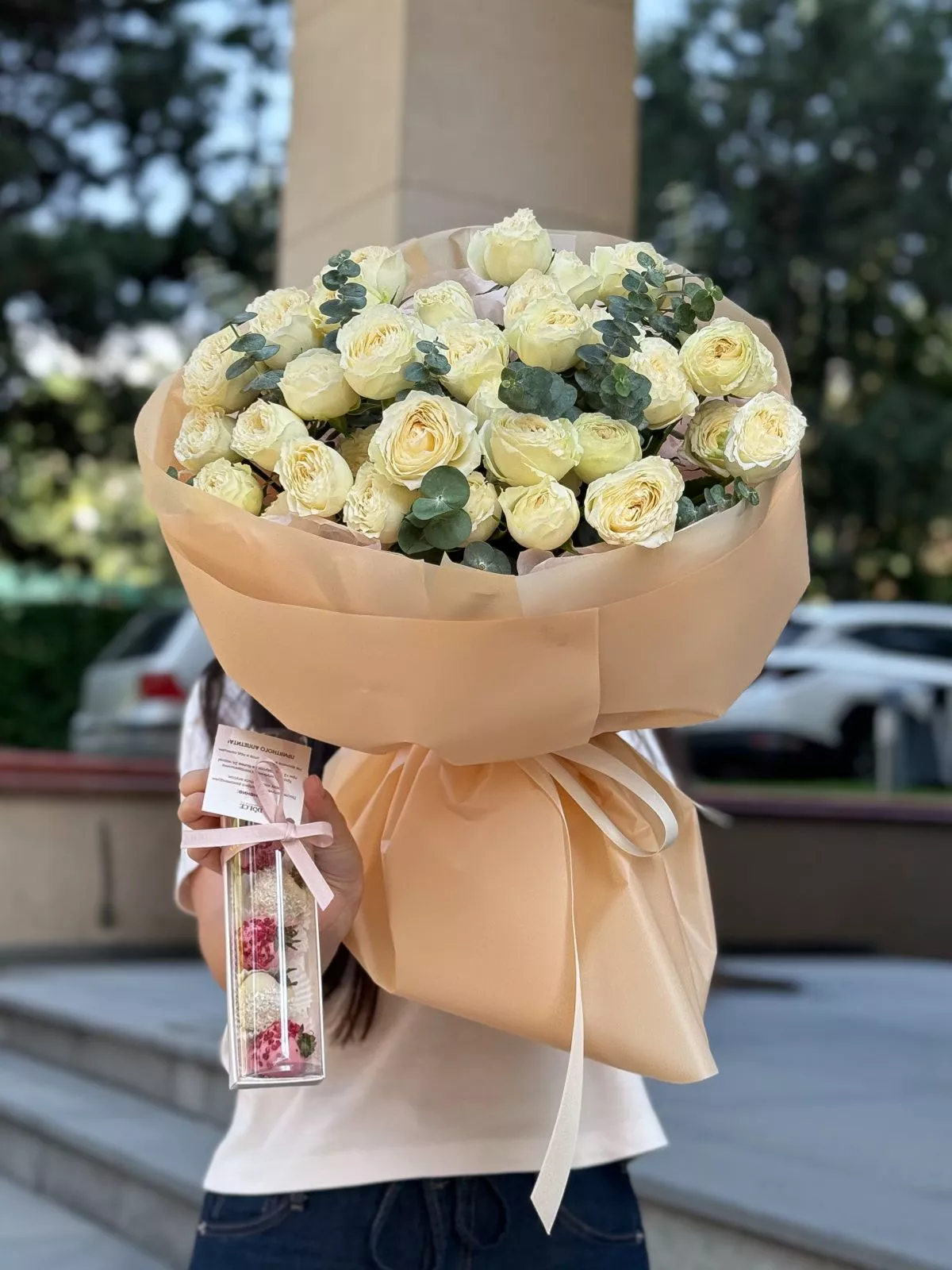 Сет "Зефирный" букет из пионовидных спрей роз и коробочка клубники в шоколаде